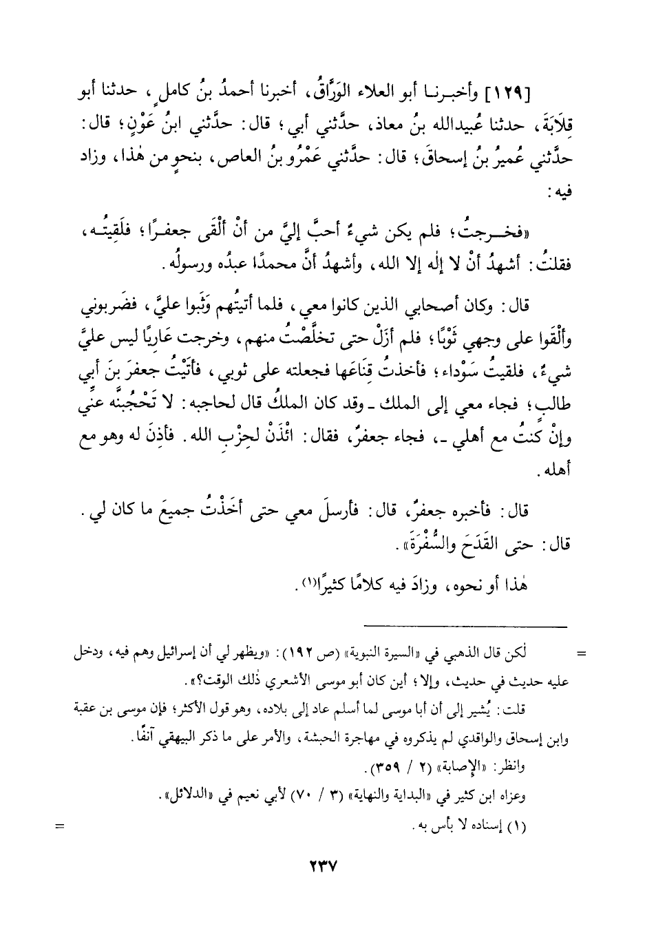 129 - وَأخْبرنَا أَبُو الْعَلَاء الْوراق أخبرنَا أَحْمد بن كَامِل حَدثنَا أَبُو قلَابَة حَدثنَا عبيد الله بن معَاذ حَدثنِي أبي قَالَ حَدثنِي ابْن عون قَالَ حَدثنِي عُمَيْر بن إِسْحَاق قَالَ حَدثنِي عَمْرو بن الْعَاصِ بِنَحْوِ من هَذَا وَزَاد فِيهِ فَخرجت فَلم يكن شَيْء أحب إِلَيّ من أَن ألْقى جعفرا فَلَقِيته فَقلت أشهد أَن لَا إِلَه إِلَّا الله وَأشْهد أَن مُحَمَّدًا عَبده وَرَسُوله قَالَ وَكَانَ أَصْحَابِي الَّذين كَانُوا معي فَلَمَّا أتيتهم وَثبُوا عَليّ فضربوني وألقوا على وَجْهي ثوبا فَلم أزل حَتَّى تخلصت مِنْهُم وَخرجت عَارِيا لَيْسَ عَليّ شَيْء فَلَقِيت سَوْدَاء فَأخذت قناعها فَجَعَلته على ثوبي فَأتيت جَعْفَر بن أبي طَالب فجَاء معي إِلَى الْملك وَقد كَانَ الْملك قَالَ لحاجبه لَا تحجبنه عني وَإِن كنت مَعَ أَهلِي فجَاء جَعْفَر فَقَالَ ائْذَنْ لحزب الله فَأذن لَهُ وَهُوَ مَعَ أَهله قَالَ فَأخْبرهُ جَعْفَر قَالَ فَأرْسل معي حَتَّى أخذت جَمِيع مَا كَانَ لي قَالَ حَتَّى الْقدح والسفرة هَذَا أَو نَحوه وَزَاد فِيهِ كلَاما كثيرا