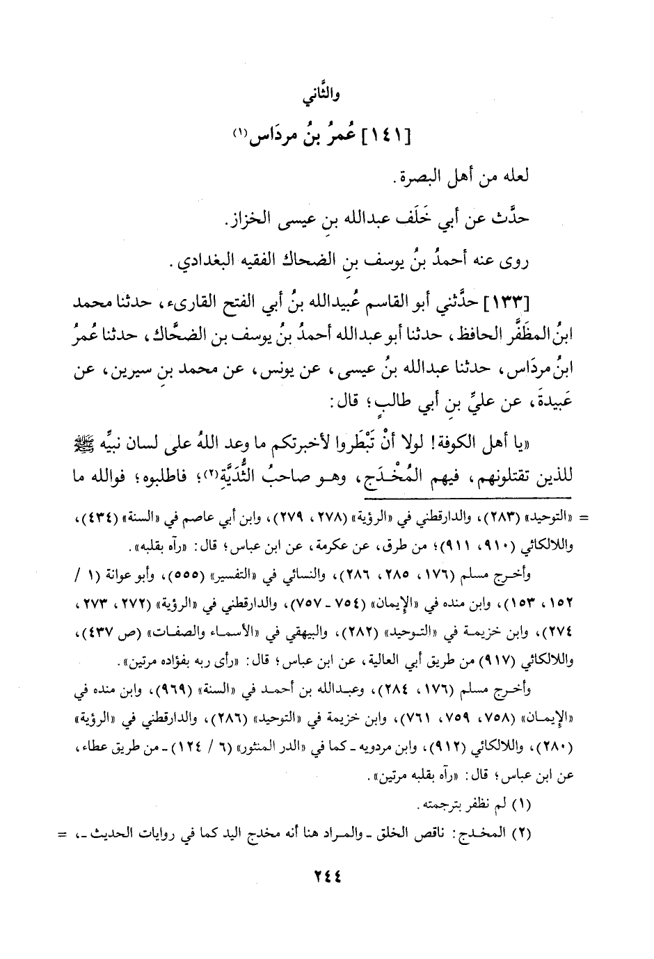133 - حَدثنِي أَبُو الْقَاسِم عبيد الله بن أبي الْفَتْح الْقَارئ حَدثنَا مُحَمَّد ابْن المظفر الْحَافِظ حَدثنَا أَبُو عبد الله أَحْمد بن يُوسُف بن الضَّحَّاك حَدثنَا عمر ابْن مرداس حَدثنَا عبد الله بن عِيسَى عَن يُونُس عَن مُحَمَّد بن سِيرِين عَن عُبَيْدَة عَن عَليّ بن أبي طَالب قَالَ يَا أهل الْكُوفَة لَوْلَا أَن تبطروا لأخبرتكم مَا وعد الله على لِسَان نبيه صلى الله عَلَيْهِ وَسلم للَّذين تقتلونهم فيهم المخدج وَهُوَ صَاحب الثدية فاطلبوه فوَاللَّه مَا