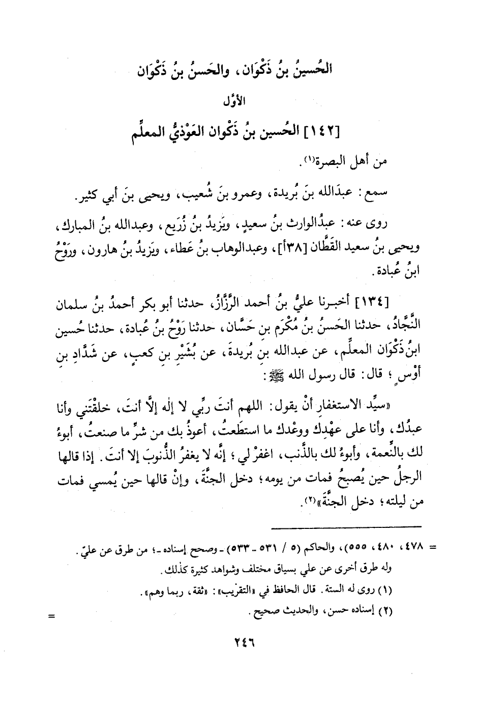 142 - الْحُسَيْن بن ذكْوَان العوذي الْمعلم من أهل الْبَصْرَة سمع عبد الله بن بُرَيْدَة وَعَمْرو بن شُعَيْب وَيحيى بن أبي كثير روى عَنهُ عبد الْوَارِث بن سعيد وَيزِيد بن زُرَيْع وَعبد الله بن الْمُبَارك وَيحيى بن سعيد الْقطَّان (38 أ) وَعبد الْوَهَّاب بن عَطاء وَيزِيد بن هَارُون وروح ابْن عبَادَة