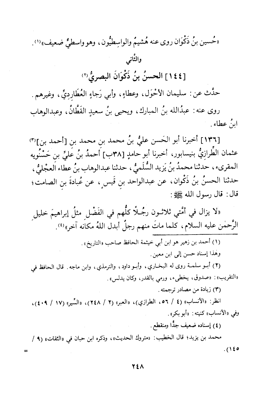 136 - أخبرنَا أَبُو الْحسن عَليّ بن مُحَمَّد بن مُحَمَّد بن (أَحْمد بن) عُثْمَان الطرازي بنيسابور أخبرنَا أَبُو حَامِد (38 ب) أَحْمد بن عَليّ بن حسنويه الْمُقْرِئ حَدثنَا مُحَمَّد بن يزِيد السّلمِيّ حَدثنَا عبد الْوَهَّاب بن عَطاء الْعجلِيّ حَدثنَا الْحسن بن ذكْوَان عَن عبد الْوَاحِد بن قيس عَن عبَادَة بن الصَّامِت قَالَ قَالَ رَسُول الله صلى الله عَلَيْهِ وَسلم لَا يزَال فِي أمتِي ثَلَاثُونَ رجلا كلهم فِي الْفضل مثل إِبْرَاهِيم خَلِيل الرَّحْمَن عَلَيْهِ السَّلَام كلما مَاتَ مِنْهُم رجل أبدل الله مَكَانَهُ آخر