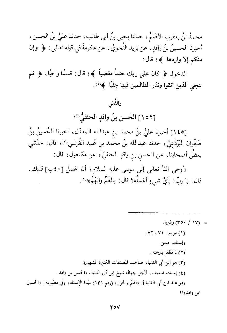 145 - أخبرنَا عَليّ بن مُحَمَّد بن عبد الله الْمعدل أخبرنَا الْحُسَيْن بن صَفْوَان البرذعي حَدثنَا عبد الله بن مُحَمَّد بن عبيد الْقرشِي قَالَ حَدثنِي بعض أَصْحَابنَا عَن الْحسن بن وَاقد الْحَنَفِيّ عَن مَكْحُول قَالَ أوحى الله تَعَالَى إِلَى مُوسَى عَلَيْهِ السَّلَام أَن اغسل قبلك قَالَ يَا رب بِأَيّ شَيْء أغسله قَالَ بالغم والهم
