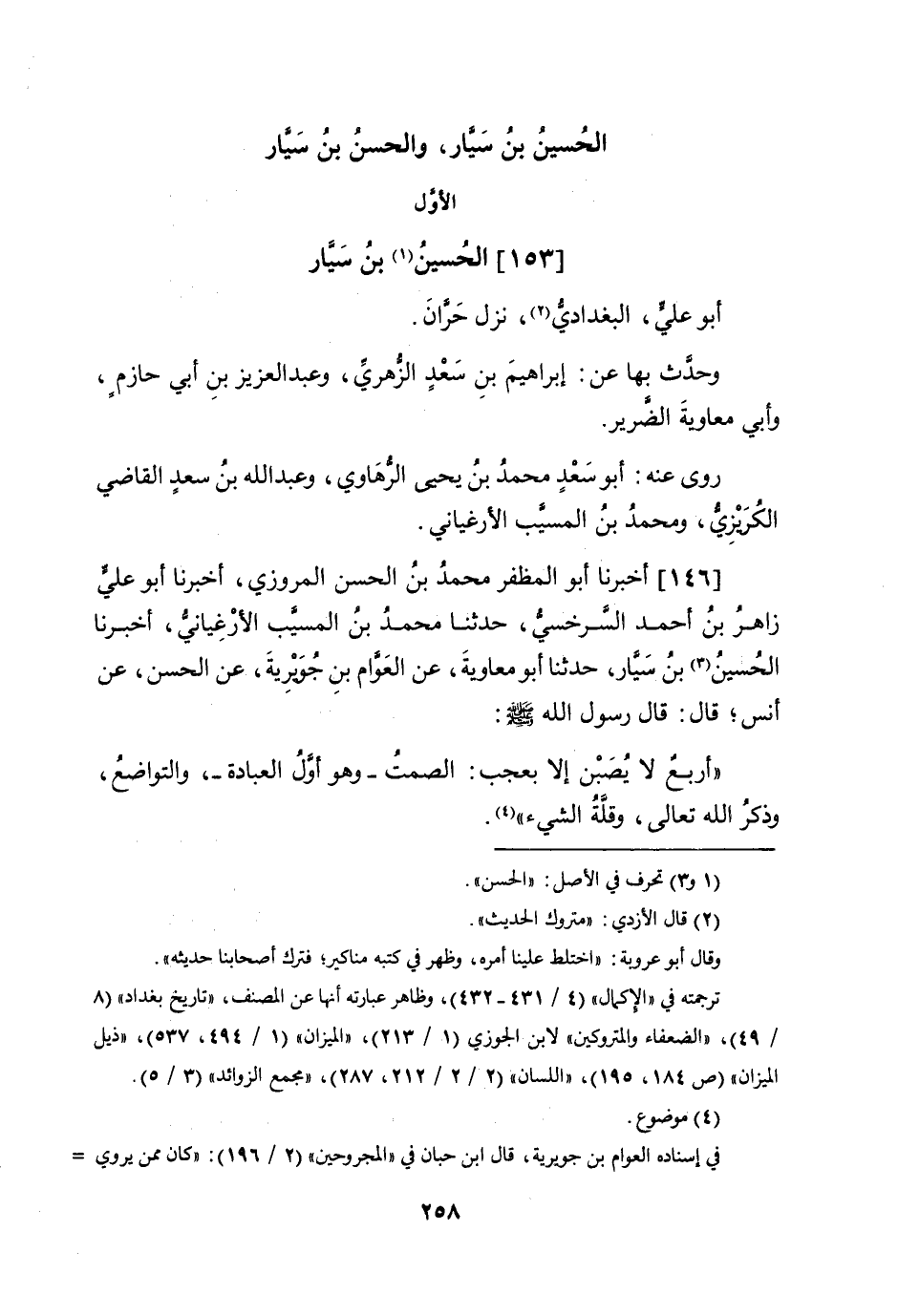 (153) الْحُسَيْن بن سيار أَبُو عَليّ الْبَغْدَادِيّ نزل حران وَحدث بهَا عَن إِبْرَاهِيم بن سعد الزُّهْرِيّ وَعبد الْعَزِيز بن أبي حَازِم وَأبي مُعَاوِيَة الضَّرِير روى عَنهُ أَبُو سعد مُحَمَّد بن يحيى الرهاوي وَعبد الله بن سعد القَاضِي الكريزي وَمُحَمّد بن الْمسيب الأرغياني
