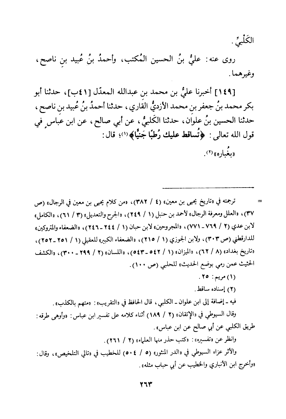 149 - أخبرنَا عَليّ بن مُحَمَّد بن عبد الله الْمعدل (41 ب) حَدثنَا أَبُو بكر مُحَمَّد بن جَعْفَر بن مُحَمَّد الْأَزْدِيّ الْقَارِي حَدثنَا أَحْمد بن عبيد بن نَاصح حَدثنَا الْحُسَيْن بن علوان حَدثنَا الْكَلْبِيّ عَن أبي صَالح عَن ابْن عَبَّاس فِي قَوْله الله تَعَالَى {تساقط عَلَيْك رطبا جنيا} قَالَ بغباره وَالثَّانِي