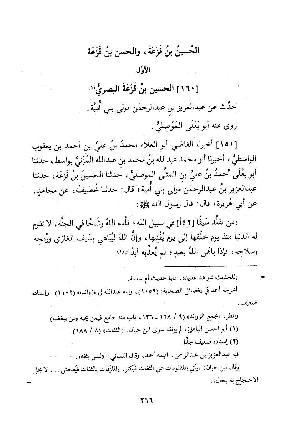 151 - أخبرنَا القَاضِي أَبُو الْعَلَاء مُحَمَّد بن عَليّ بن أَحْمد بن يَعْقُوب الوَاسِطِيّ أخبرنَا أَبُو مُحَمَّد عبد الله بن مُحَمَّد بن عبد الله الْمُزنِيّ بواسط حَدثنَا عبد الْعَزِيز بن عبد الرَّحْمَن مولى بني أُميَّة قَالَ حَدثنَا خصيف عَن مُجَاهِد عَن أبي هُرَيْرَة قَالَ قَالَ رَسُول الله صلى الله عَلَيْهِ وَسلم من تقلد سَيْفا (42 أ) فِي سَبِيل الله قَلّدهُ الله وشاحا فِي الْجنَّة لَا تقوم لَهُ الدُّنْيَا مُنْذُ يَوْم خلقهَا إِلَى يَوْم يفنيها وَإِن الله ليباهي بِسيف الْغَازِي وَرمحه وسلاحه فَإِذا باهى الله بِعَبْد لم يعذبه أبدا وَالثَّانِي