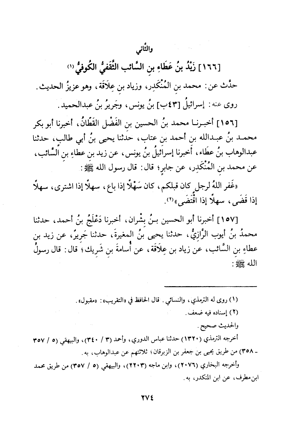 156 - أخبرنَا مُحَمَّد بن الْحُسَيْن بن الْفضل الْقطَّان أخبرنَا أَبُو بكر مُحَمَّد بن عبد الله بن أَحْمد بن عتاب حَدثنَا يحيى بن أبي طَالب حَدثنَا عبد الْوَهَّاب بن عَطاء أخبرنَا إِسْرَائِيل بن يُونُس عَن زيد بن عَطاء بن السَّائِب عَن مُحَمَّد بن الْمُنْكَدر عَن جَابر قَالَ قَالَ رَسُول الله صلى الله عَلَيْهِ وَسلم غفر الله لرجل كَانَ قبلكُمْ كَانَ سهلا إِذا بَاعَ سهلا إِذا اشْترى سهلا إِذا قضى سهلا إِذا اقْتضى