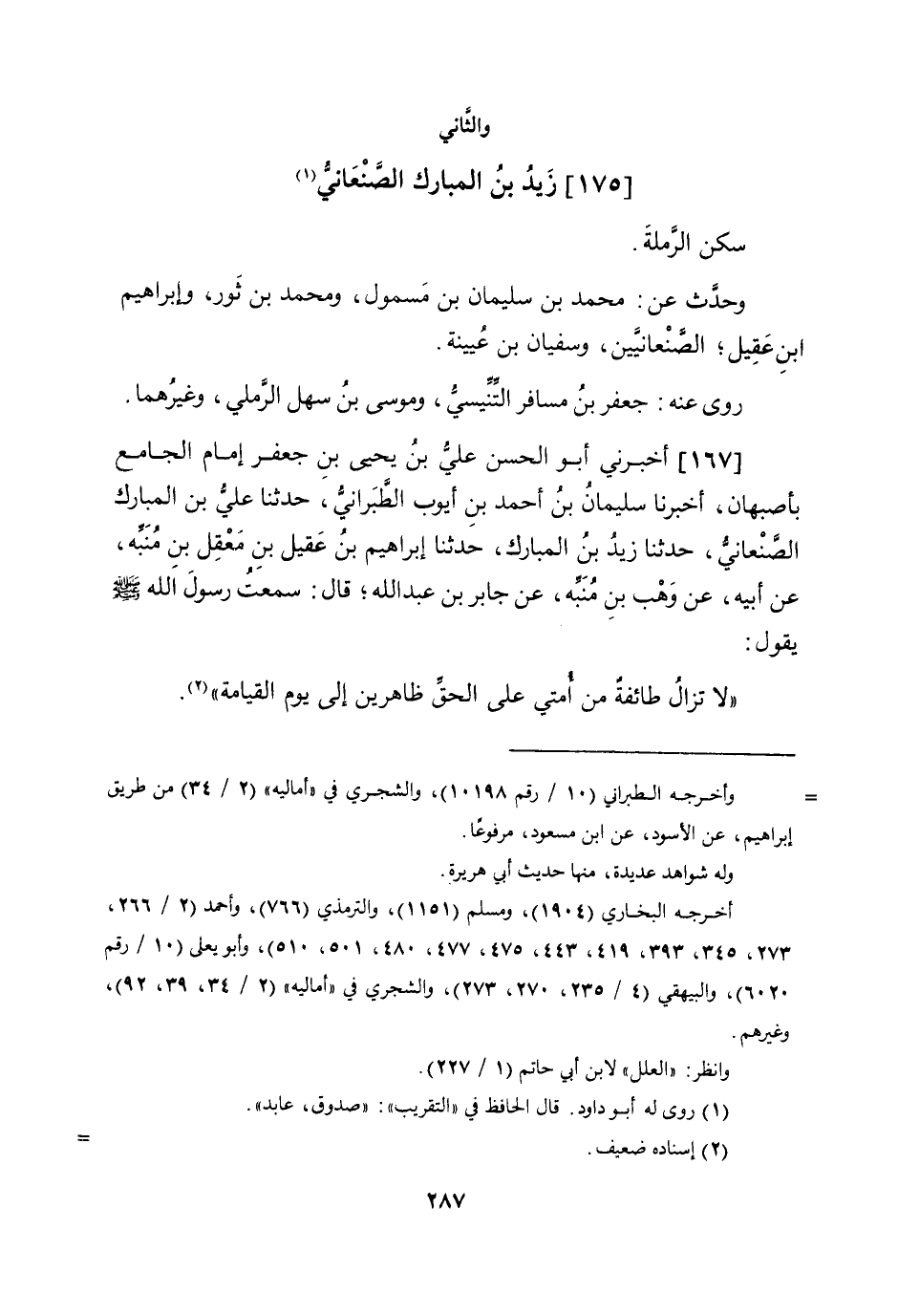 175 - زيد بن الْمُبَارك الصَّنْعَانِيّ سكن الرملة وَحدث عَن مُحَمَّد بن سُلَيْمَان بن مسمول وَمُحَمّد بن ثَوْر وَإِبْرَاهِيم ابْن عقيل الصنعانيين وسُفْيَان بن عُيَيْنَة روى عَنهُ جَعْفَر بن مُسَافر التنيسِي ومُوسَى بن سهل الرَّمْلِيّ وَغَيرهمَا