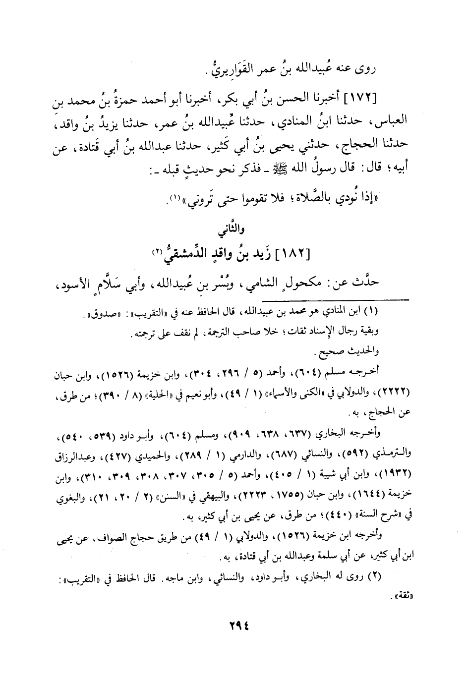 172 - أخبرنَا الْحسن بن أبي بكر أخبرنَا أَبُو أَحْمد حَمْزَة بن مُحَمَّد بن الْعَبَّاس حَدثنَا ابْن الْمُنَادِي حَدثنَا عبيد الله بن عمر حَدثنَا يزِيد بن وَاقد حَدثنَا الْحجَّاج حَدثنِي يحيى بن أبي كثير حَدثنَا عبد الله بن أبي قَتَادَة عَن أَبِيه قَالَ قَالَ رَسُول الله صلى الله عَلَيْهِ وَسلم فَذكر نَحْو حَدِيث قبله إِذا نُودي بِالصَّلَاةِ فَلَا تقوموا حَتَّى تروني وَالثَّانِي