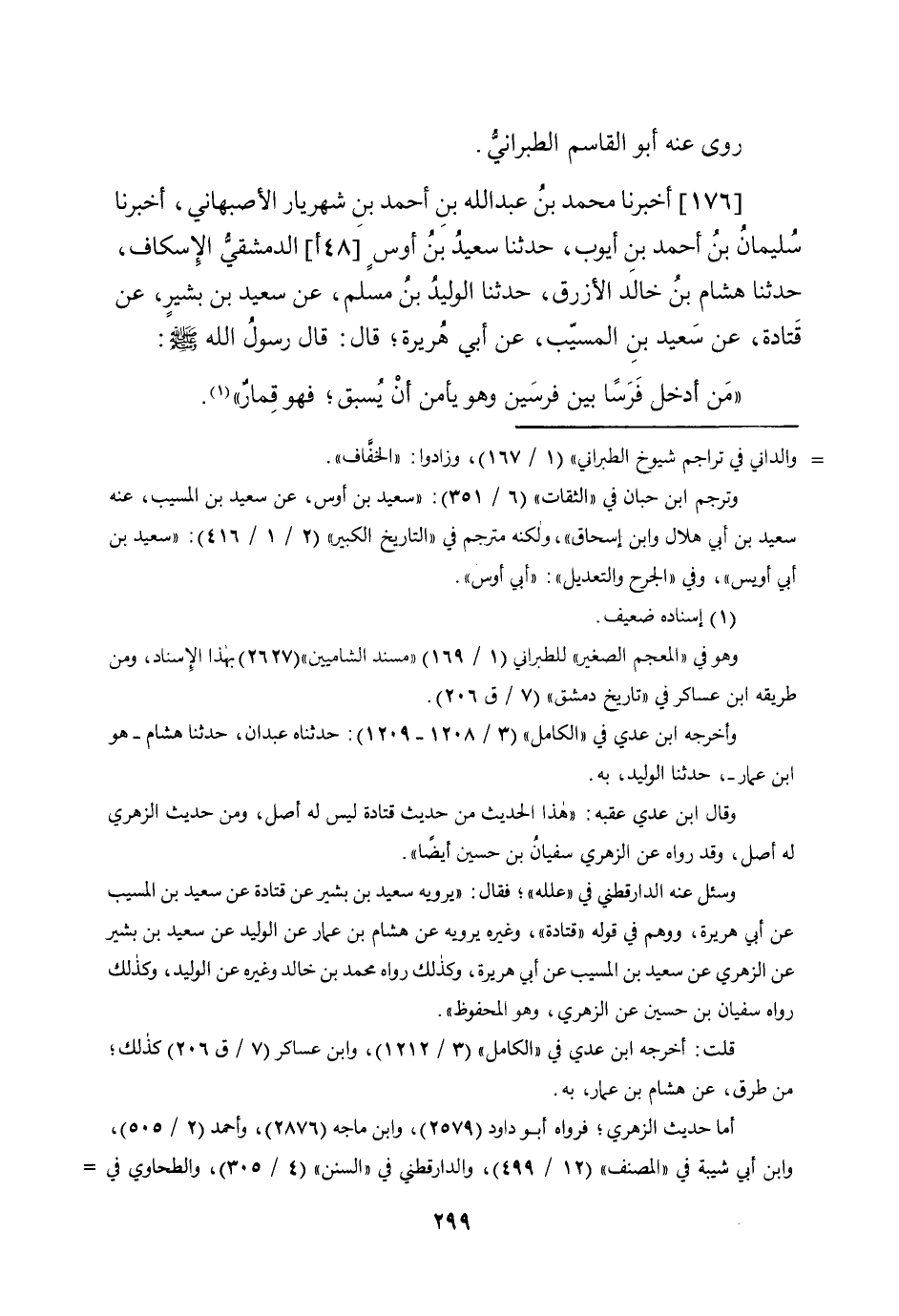176 - أخبرنَا مُحَمَّد بن عبد الله بن أَحْمد بن شهريار الْأَصْبَهَانِيّ أخبرنَا سُلَيْمَان بن أَحْمد بن أَيُّوب حَدثنَا سعيد بن أَوْس (48 أ) الدِّمَشْقِي الإسكاف حَدثنَا هِشَام بن خَالِد الْأَزْرَق حَدثنَا الْوَلِيد بن مُسلم عَن سعيد بن بشير عَن قَتَادَة عَن سعيد بن الْمسيب عَن أبي هُرَيْرَة قَالَ قَالَ رَسُول الله صلى الله عَلَيْهِ وَسلم من أَدخل فرسا بَين فرسين وَهُوَ يَأْمَن أَن يسْبق فَهُوَ قمار قَالَ سُلَيْمَان لم يروه عَن قتاده إِلَّا سعيد وَلَا عَنهُ إِلَّا الْوَلِيد تفرد بِهِ هِشَام وَالثَّانِي