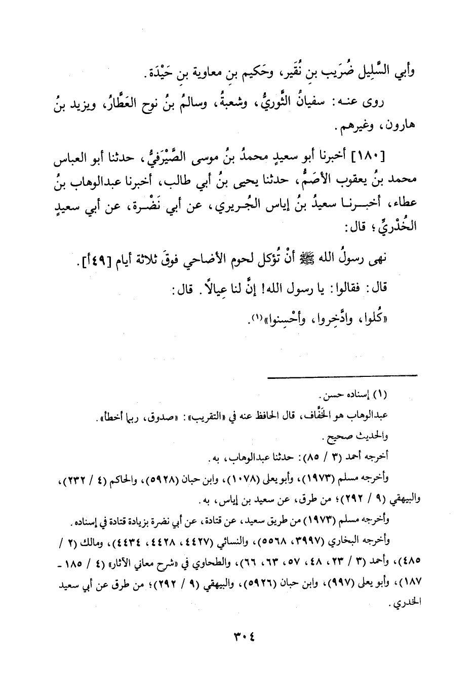 180 - أخبرنَا أَبُو سعيد مُحَمَّد بن مُوسَى الصَّيْرَفِي حَدثنَا أَبُو الْعَبَّاس مُحَمَّد بن يَعْقُوب الْأَصَم حَدثنَا يحيى بن أبي طَالب أخبرنَا عبد الْوَهَّاب بن عَطاء أخبرنَا سعيد بن إِيَاس الْجريرِي عَن أبي نَضرة عَن أبي سعيد الْخُدْرِيّ قَالَ نهى رَسُول الله صلى الله عَلَيْهِ وَسلم أَن تُؤْكَل لُحُوم الْأَضَاحِي فَوق ثَلَاثَة أَيَّام (49 أ) قَالَ فَقَالُوا يَا رَسُول الله إِن لنا عيالا قَالَ كلوا وَادخرُوا وأحسنوا وَالثَّانِي