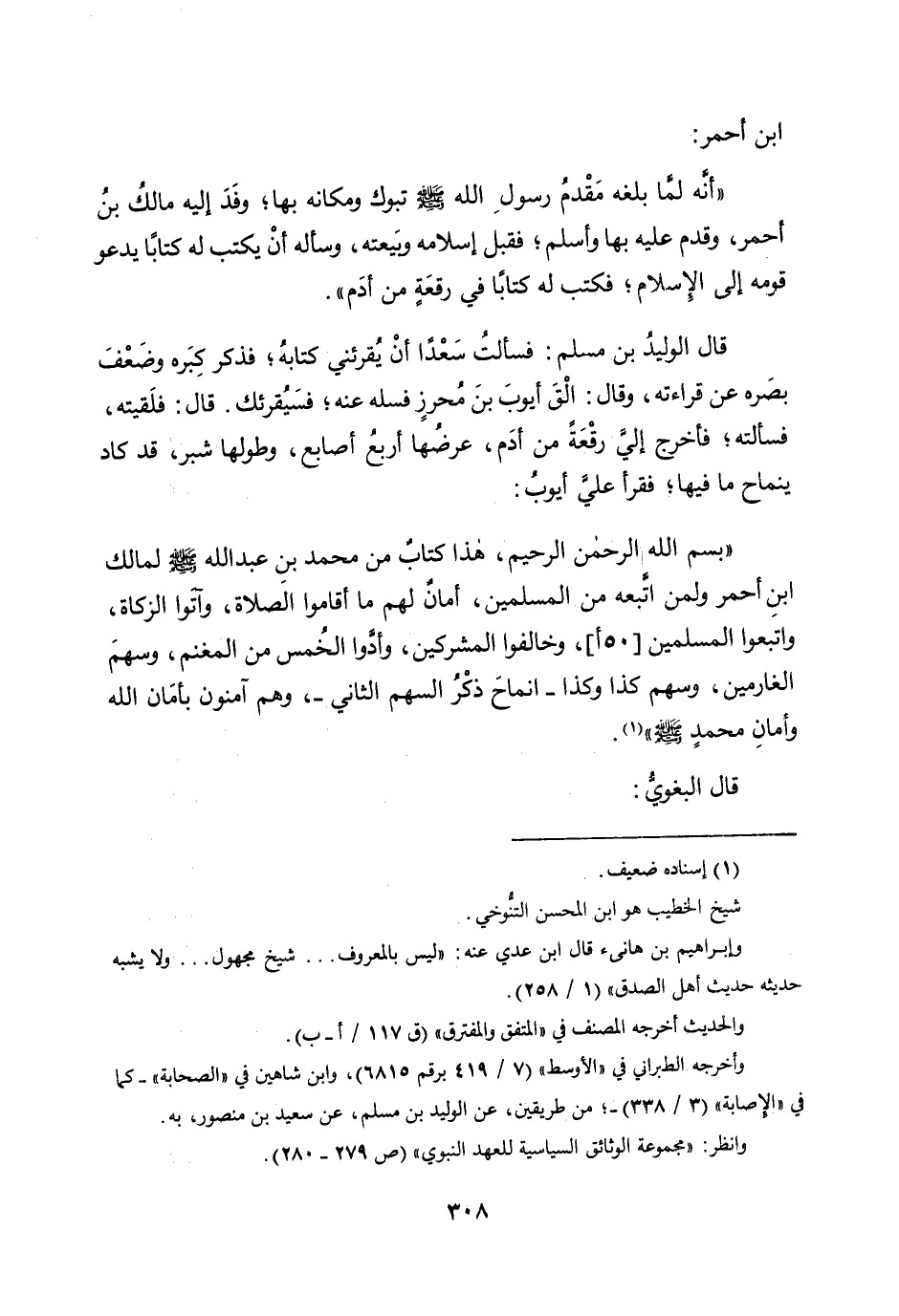 ابْن أَحْمَر أَنه لما بلغه مقدم رَسُول الله صلى الله عَلَيْهِ وَسلم تَبُوك ومكانه بهَا وَفد إِلَيْهِ مَالك بن أَحْمَر وَقدم عَلَيْهِ بهَا وَأسلم فَقبل إِسْلَامه وبيعته وَسَأَلَهُ أَن يكْتب لَهُ كتابا يَدْعُو قومه إِلَى الْإِسْلَام فَكتب لَهُ كتابا فِي رقْعَة من أَدَم قَالَ الْوَلِيد بن مُسلم فَسَأَلت سَعْدا أَن يُقْرِئُنِي كِتَابه فَذكر كبره وَضعف بَصَره عَن قِرَاءَته وَقَالَ الق أَيُّوب بن مُحرز فسله عَنهُ فسيقرئك قَالَ فَلَقِيته فَسَأَلته فَأخْرج إِلَى رقْعَة من أَدَم عرضهَا أَربع أَصَابِع وطولها شبر قد كَاد ينماح مَا فِيهَا فَقَرَأَ عَليّ أَيُّوب بِسم الله الرَّحْمَن الرَّحِيم هَذَا كتاب من مُحَمَّد بن عبد الله صلى الله عَلَيْهِ وَسلم لمَالِك ابْن أَحْمَر وَلمن اتبعهُ من الْمُسلمين أَمَان لَهُم مَا أَقَامُوا الصَّلَاة وَآتوا الزَّكَاة وَاتبعُوا الْمُسلمين (50 أ) وخالفوا الْمُشْركين وأدوا الْخمس من الْمغنم وَسَهْم الغارمين وَسَهْم كَذَا وَكَذَا انماح ذكر السهْم الثَّانِي وهم آمنون بِأَمَان الله وأمان مُحَمَّد صلى الله عَلَيْهِ وَسلم قَالَ الْبَغَوِيّ