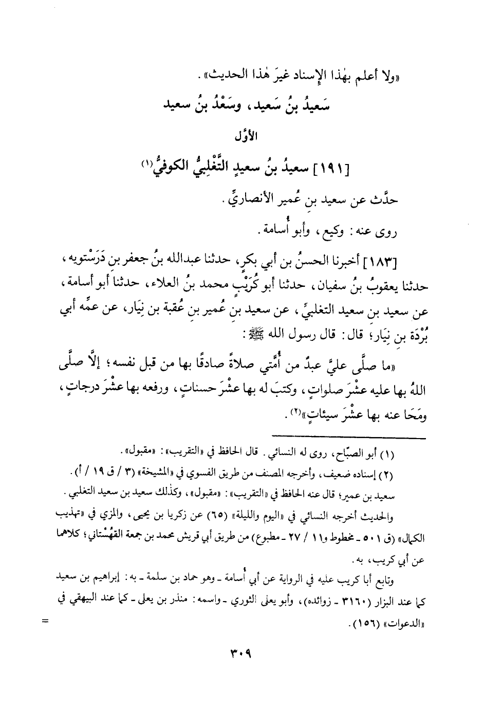 183 - أخبرنَا الْحسن بن أبي بكر حَدثنَا عبد الله بن جَعْفَر بن درسْتوَيْه حَدثنَا يَعْقُوب بن سُفْيَان حَدثنَا أَبُو كريب مُحَمَّد بن الْعَلَاء حَدثنَا أَبُو أُسَامَة عَن سعيد بن سعيد التغلبي عَن سعيد بن عُمَيْر بن عقبَة بن نيار عَن عَمه أبي بردة بن نيار قَالَ قَالَ رَسُول الله صلى الله عَلَيْهِ وَسلم مَا صلى عَليّ عبد من أمتِي صَلَاة صَادِقا بهَا من قبل نَفسه إِلَّا صلى الله بهَا عَلَيْهِ عشر صلوَات وَكتب لَهُ بهَا عشر حَسَنَات وَرَفعه بهَا عشر دَرَجَات ومحا عَنهُ بهَا عشر سيئات