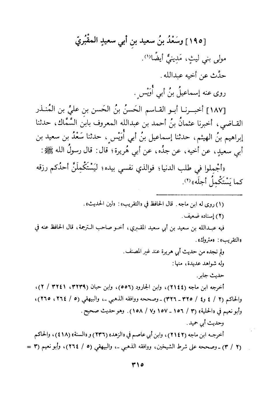 (195) وَسعد بن سعيد بن أبي سعيد المَقْبُري مولى بني لَيْث مديني أَيْضا حدث عَن أَخِيه عبد الله روى