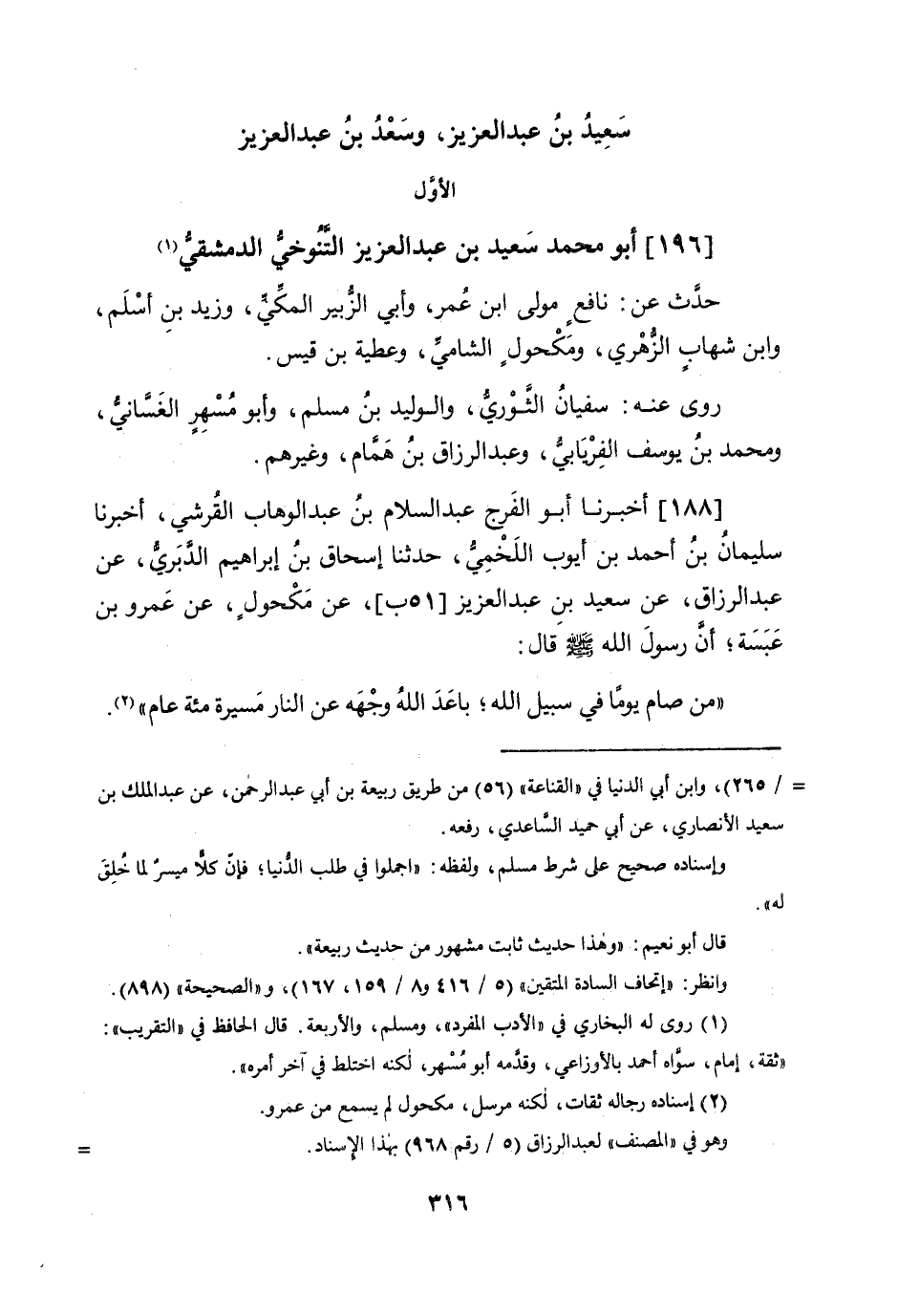 (196) أَبُو مُحَمَّد سعيد بن عبد الْعَزِيز التنوخي الدِّمَشْقِي حدث عَن نَافِع مولى ابْن عمر وَأبي الزبير الْمَكِّيّ وَزيد بن أسلم وَابْن شهَاب الزُّهْرِيّ وَمَكْحُول الشَّامي وعطية بن قيس روى عَنهُ سُفْيَان الثَّوْريّ والوليد بن مُسلم وَأَبُو مسْهر الغساني وَمُحَمّد بن يُوسُف الْفرْيَابِيّ وَعبد الرَّزَّاق بن همام وَغَيرهم