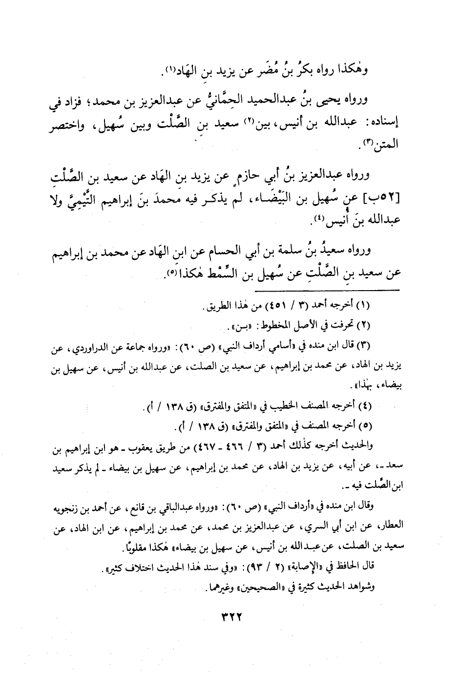 وَهَكَذَا رَوَاهُ بكر بن مُضر عَن يزِيد بن الْهَاد وَرَوَاهُ يحيى بن عبد الحميد الْحمانِي عَن عبد الْعَزِيز بن مُحَمَّد فَزَاد فِي إِسْنَاده عبد الله بن أنيس بَين سعيد بن الصَّلْت وَبَين سُهَيْل وَاخْتصرَ الْمَتْن وَرَوَاهُ عبد الْعَزِيز بن أبي حَازِم عَن يزِيد بن الْهَاد عَن سعيد بن الصَّلْت (52 ب) عَن سُهَيْل بن الْبَيْضَاء لم يذكر فِيهِ مُحَمَّد بن إِبْرَاهِيم التَّيْمِيّ وَلَا عبد الله بن أنيس وَرَوَاهُ سعيد بن سَلمَة بن أبي الحسام عَن ابْن الْهَاد عَن مُحَمَّد بن إِبْرَاهِيم عَن سعيد بن الصَّلْت عَن سُهَيْل بن السمط هَكَذَا