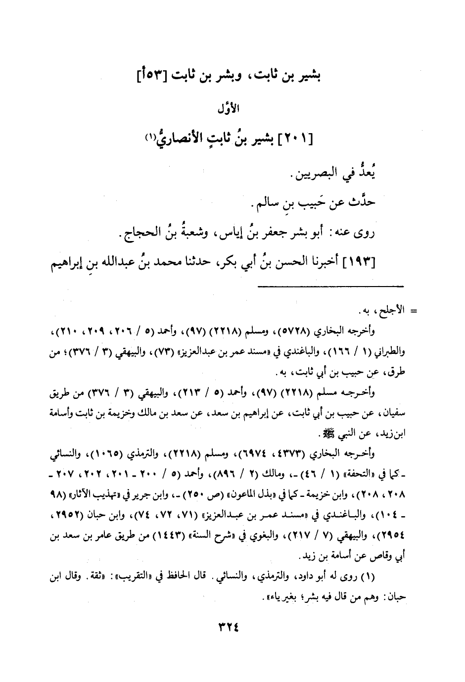 (201) بشير بن ثَابت الْأنْصَارِيّ يعد فِي الْبَصرِيين حدث عَن حبيب بن سَالم روى عَنهُ أَبُو بشر جَعْفَر بن إِيَاس وَشعْبَة بن الْحجَّاج