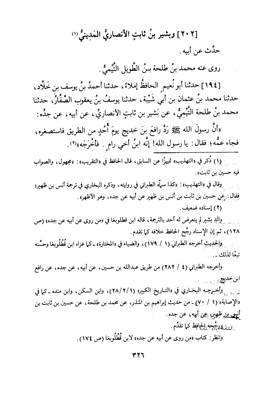 194 - حَدثنَا أَبُو نعيم الْحَافِظ إملاء حَدثنَا أَحْمد بن يُوسُف بن خَلاد حَدثنَا مُحَمَّد بن عُثْمَان بن أبي شيبَة حَدثنَا يُوسُف بن يَعْقُوب الصفار حَدثنَا مُحَمَّد بن طَلْحَة التَّيْمِيّ عَن بشير بن ثَابت الْأنْصَارِيّ عَن أَبِيه عَن جده أَن رَسُول الله صلى الله عَلَيْهِ وَسلم رد رَافع بن خديج يَوْم أحد من الطَّرِيق فاستصغره فجَاء عَمه فَقَالَ يَا رَسُول الله إِنَّه ابْن أخي رام فَأخْرجهُ