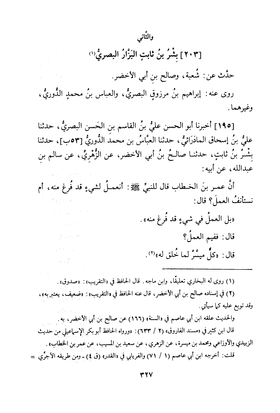 195 - أخبرنَا أَبُو الْحسن عَليّ بن الْقَاسِم بن الْحسن الْبَصْرِيّ حَدثنَا عَليّ بن إِسْحَاق المادرائي حَدثنَا الْعَبَّاس بن مُحَمَّد الدوري (53 ب) حَدثنَا بشر بن ثَابت حَدثنَا صَالح بن أبي الْأَخْضَر عَن الزُّهْرِيّ عَن سَالم بن عبد الله عَن أَبِيه أَن عمر بن الْخطاب قَالَ للنَّبِي صلى الله عَلَيْهِ وَسلم أنعمل لشَيْء قد فرغ مِنْهُ أم نستأنف الْعَمَل قَالَ بل الْعَمَل فِي شَيْء قد فرغ مِنْهُ قَالَ فَفِيمَ الْعَمَل قَالَ كل ميسر لما خلق لَهُ