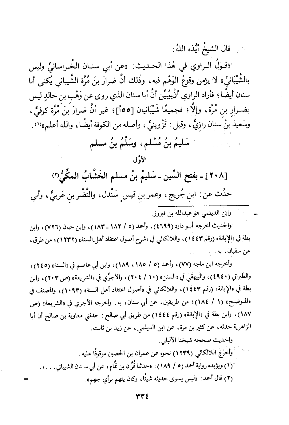 قَالَ الشَّيْخ أيده الله قَول الرَّاوِي فِي هَذَا الحَدِيث عَن أبي سِنَان الْخُرَاسَانِي وَلَيْسَ بالشيباني لَا يُؤمن وُقُوع الْوَهم فِيهِ وَذَلِكَ أَن ضرار بن مرّة الشَّيْبَانِيّ يكنى أَبَا سِنَان أَيْضا فَأَرَادَ الرَّاوِي أَن يبين أَن أَبَا سِنَان الَّذِي روى عَن وهب بن خَالِد لَيْسَ بضرار بن مرّة وَإِلَّا فجميعا شيبانيان (55 أ) غير أَن ضرار بن مرّة كُوفِي وَسَعِيد بن سِنَان رازي وَقيل قزويني وَأَصله من الْكُوفَة أَيْضا وَالله أعلم