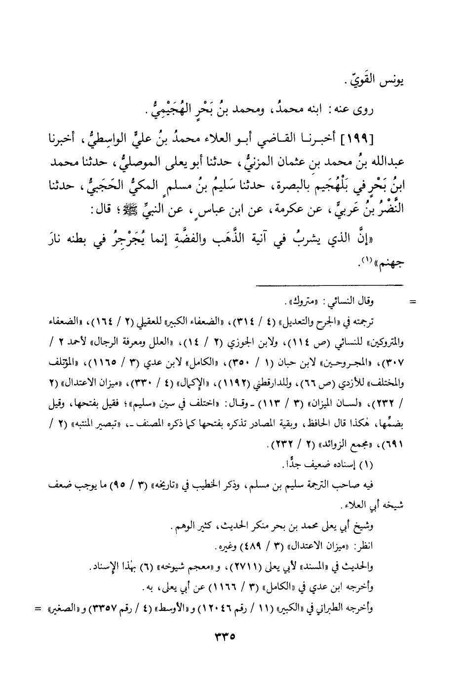 199 - أخبرنَا القَاضِي أَبُو الْعَلَاء مُحَمَّد بن عَليّ الوَاسِطِيّ أخبرنَا عبد الله بن مُحَمَّد بن عُثْمَان الْمُزنِيّ حَدثنَا أَبُو يعلى الْموصِلِي حَدثنَا مُحَمَّد ابْن بَحر فِي بلهجيم بِالْبَصْرَةِ حَدثنَا سليم بن مُسلم الْمَكِّيّ الحَجبي حَدثنَا النَّضر بن عَرَبِيّ عَن عِكْرِمَة عَن ابْن عَبَّاس عَن النَّبِي صلى الله عَلَيْهِ وَسلم قَالَ إِن الَّذِي يشرب فِي آنِية الذَّهَب وَالْفِضَّة إِنَّمَا يجرجر فِي بَطْنه نَار جَهَنَّم
