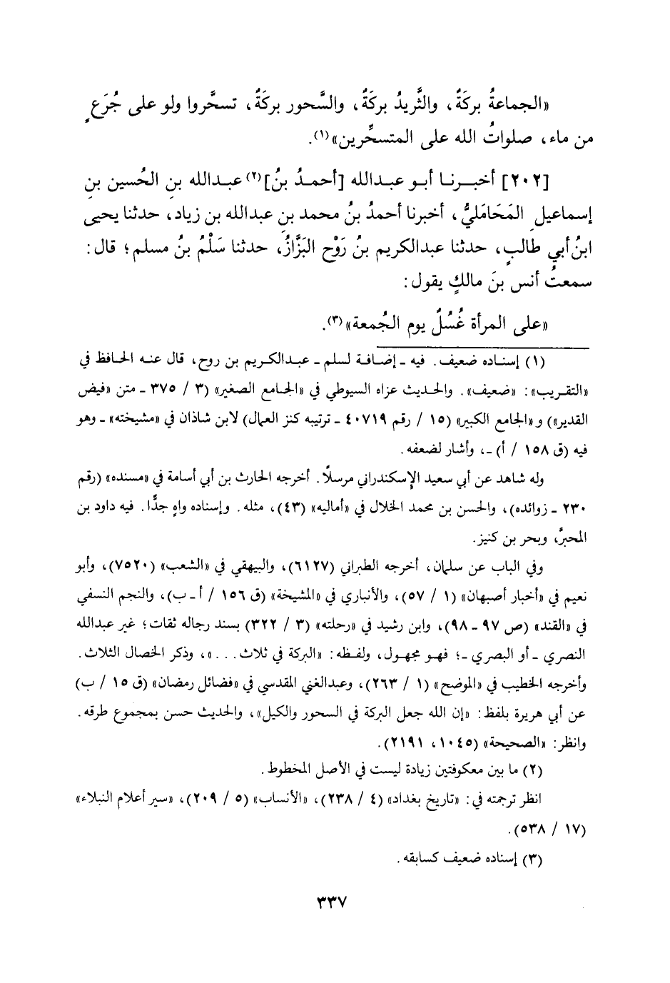 202 - أخبرنَا أَبُو عبد الله (أَحْمد بن) عبد الله بن الْحُسَيْن بن إِسْمَاعِيل الْمحَامِلِي أخبرنَا أَحْمد بن مُحَمَّد بن عبد الله بن زِيَاد حَدثنَا يحيى ابْن أبي طَالب حَدثنَا عبد الْكَرِيم بن روح الْبَزَّاز حَدثنَا سلم بن مُسلم قَالَ سَمِعت أنس بن مَالك يَقُول على الْمَرْأَة غسل يَوْم الْجُمُعَة