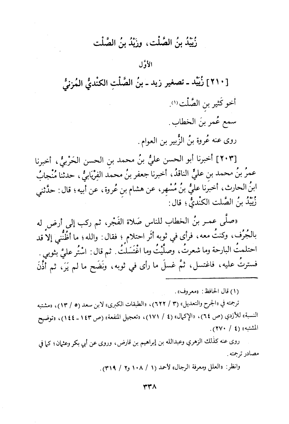 بن مُحَمَّد الْفرْيَابِيّ حَدثنَا منْجَاب ابْن الْحَارِث أخبرنَا عَليّ بن مسْهر عَن هِشَام بن عُرْوَة عَن أَبِيه قَالَ حَدثنِي زييد بن الصَّلْت الْكِنْدِيّ قَالَ صلى عمر بن الْخطاب للنَّاس صَلَاة الْفجْر ثمَّ ركب إِلَى أَرض لَهُ بالجرف وَكنت مَعَه فَرَأى فِي ثَوْبه أثر احْتِلَام فَقَالَ وَالله مَا أظنني إِلَّا قد احْتَلَمت البارحة وَمَا شَعرت وَصليت وَمَا اغْتَسَلت ثمَّ قَالَ اسْتُرْ عَليّ بثوبي فسترت عَلَيْهِ فاغتسل ثمَّ غسل مَا رأى فِي ثَوْبه ونضح مَا لم ير ثمَّ أذن