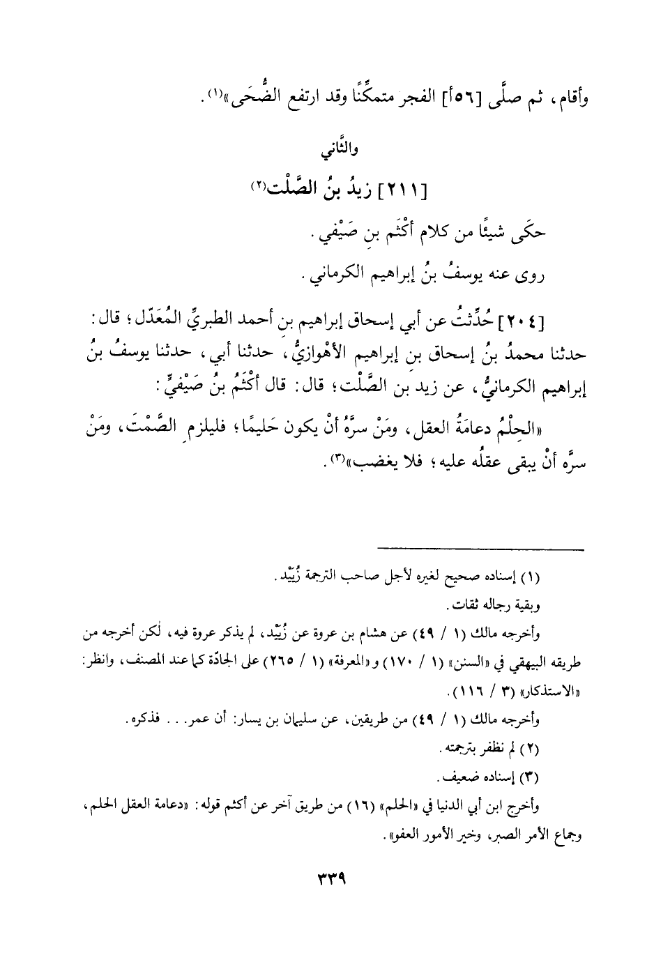204 - حدثت عَن أبي إِسْحَاق إِبْرَاهِيم بن أَحْمد الطَّبَرِيّ الْمعدل قَالَ حَدثنَا مُحَمَّد بن إِسْحَاق بن إِبْرَاهِيم الْأَهْوَازِي حَدثنَا أبي حَدثنَا يُوسُف بن إِبْرَاهِيم الْكرْمَانِي عَن زيد بن الصَّلْت قَالَ قَالَ أَكْثَم بن صَيْفِي الْحلم دعامة الْعقل وَمن سره أَن يكون حَلِيمًا فليلزم الصمت وَمن سره أَن يبْقى عقله عَلَيْهِ فَلَا يغْضب