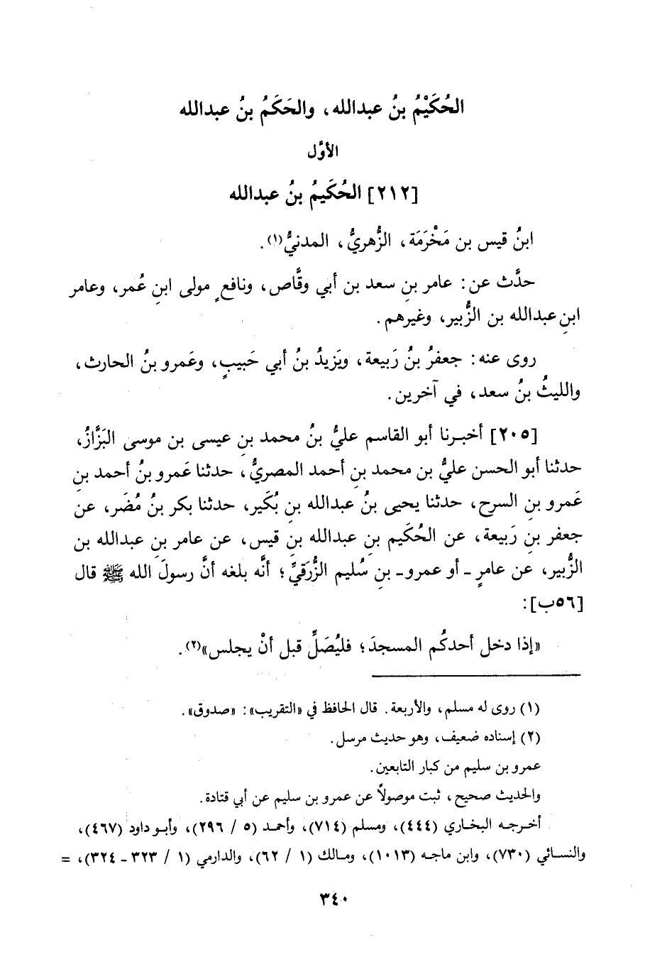205 - أخبرنَا أَبُو الْقَاسِم عَليّ بن مُحَمَّد بن عِيسَى بن مُوسَى الْبَزَّاز حَدثنَا أَبُو الْحسن عَليّ بن مُحَمَّد بن أَحْمد الْمصْرِيّ حَدثنَا عَمْرو بن أَحْمد بن عَمْرو بن السَّرْح حَدثنَا يحيى بن عبد الله بن بكير حَدثنَا بكر بن مُضر عَن جَعْفَر بن ربيعَة عَن الْحَكِيم بن عبد الله بن قيس عَن عَامر بن عبد الله بن الزبير عَن عَامر أَو عَمْرو بن سليم الزرقي أَنه بلغه أَن رَسُول الله صلى الله عَلَيْهِ وَسلم قَالَ (56 ب) إِذا دخل أحدكُم الْمَسْجِد فَليصل قبل أَن يجلس قَالَ أَبُو الْحسن الْمصْرِيّ وَفِي كتابي عَن عَامر بن سليم وَالْمَعْرُوف عَمْرو بن سليم فضربته بِالشَّكِّ وَأما