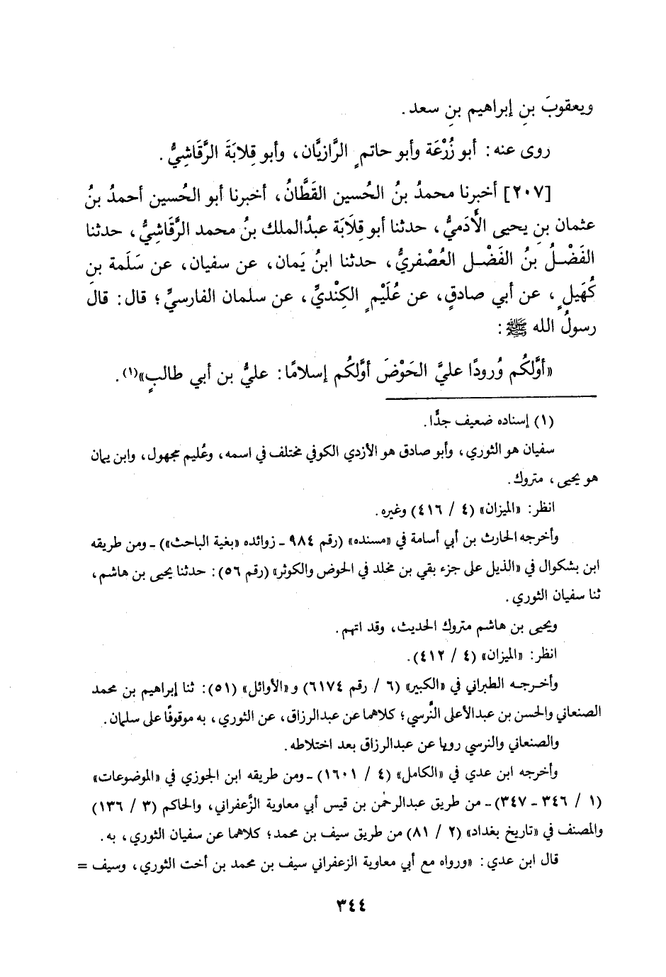 207 - أخبرنَا مُحَمَّد بن الْحُسَيْن الْقطَّان أخبرنَا أَبُو الْحُسَيْن أَحْمد بن عُثْمَان بن يحيى الأدمِيّ حَدثنَا أَبُو قلَابَة عبد الْملك بن مُحَمَّد الرقاشِي حَدثنَا الْفضل بن الْفضل الْعُصْفُرِي حَدثنَا ابْن يمَان عَن سُفْيَان عَن سَلمَة بن كهيل عَن أبي صَادِق عَن عليم الْكِنْدِيّ عَن سلمَان الْفَارِسِي قَالَ قَالَ رَسُول الله صلى الله عَلَيْهِ وَسلم أولكم ورودا عَليّ الْحَوْض أولكم إسلاما عَليّ بن أبي طَالب