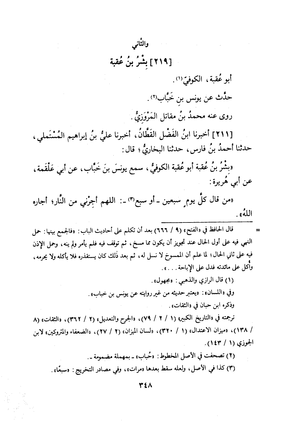 211 - أخبرنَا ابْن الْفضل الْقطَّان أخبرنَا عَليّ بن إِبْرَاهِيم الْمُسْتَمْلِي حَدثنَا أَحْمد بن فَارس حَدثنَا البُخَارِيّ قَالَ بشر بن عقبَة أَبُو عقبَة الْكُوفِي سمع يُونُس بن خباب عَن أبي عَلْقَمَة عَن أبي هُرَيْرَة من قَالَ كل يَوْم سبعين أَو سبع اللَّهُمَّ أجرني من النَّار أجاره الله