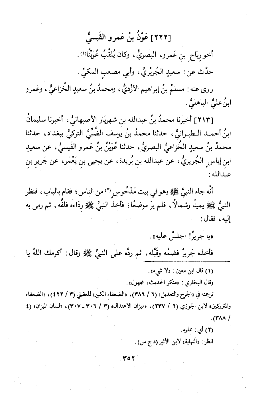(222) عون بن عَمْرو الْقَيْسِي أَخُو ريَاح بن عَمْرو الْبَصْرِيّ وَكَانَ يلقب عوينا حدث عَن سعيد الْجريرِي وَأبي مُصعب الْمَكِّيّ روى عَنهُ مُسلم بن إِبْرَاهِيم الْأَزْدِيّ وَمُحَمّد بن سعيد الْخُزَاعِيّ وَعَمْرو ابْن عَليّ الْبَاهِلِيّ