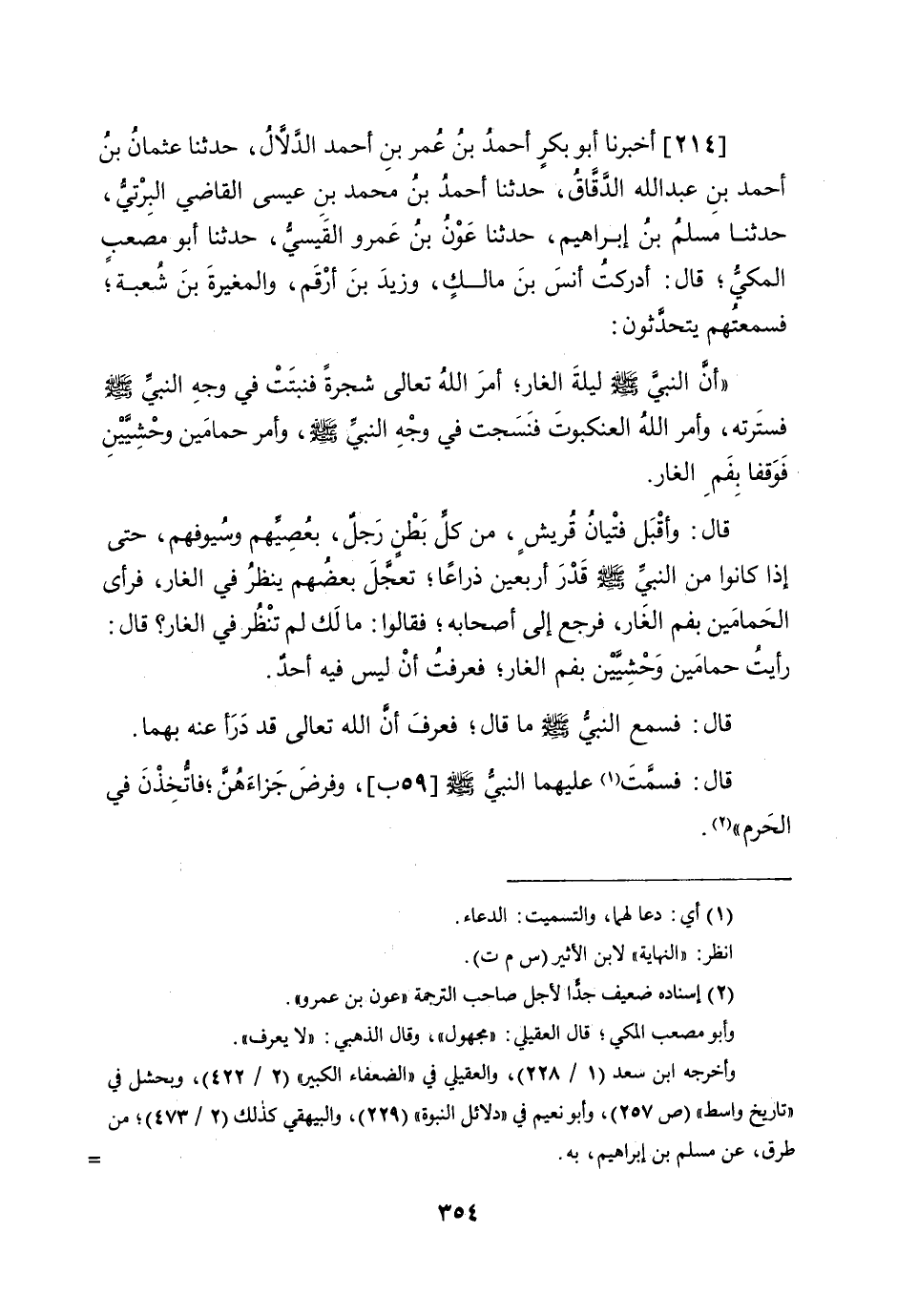 214 - أخبرنَا أَبُو بكر أَحْمد بن عمر بن أَحْمد الدَّلال حَدثنَا عُثْمَان بن أَحْمد بن عبد الله الدقاق حَدثنَا أَحْمد بن مُحَمَّد بن عِيسَى القَاضِي البرتي حَدثنَا مُسلم بن إِبْرَاهِيم حَدثنَا عون بن عَمْرو الْقَيْسِي حَدثنَا أَبُو مُصعب الْمَكِّيّ قَالَ أدْركْت أنس بن مَالك وَزيد بن أَرقم والمغيرة بن شُعْبَة فَسَمِعتهمْ يتحدثون أَن النَّبِي صلى الله عَلَيْهِ وَسلم لَيْلَة الْغَار أَمر الله تَعَالَى شَجَرَة فَنَبَتَتْ فِي وَجه النَّبِي صلى الله عَلَيْهِ وَسلم فَسترته وَأمر الله العنكبوت فَنسجَتْ فِي وَجه النَّبِي صلى الله عَلَيْهِ وَسلم وَأمر حمامين وحشيين فوقفا بِفَم الْغَار قَالَ وَأَقْبل فتيَان قُرَيْش من كل بطن رجل بِعِصِيِّهِمْ وَسُيُوفهمْ حَتَّى إِذا كَانُوا من النَّبِي صلى الله عَلَيْهِ وَسلم قدر أَرْبَعِينَ ذِرَاعا تعجل بَعضهم ينظر فِي الْغَار فَرَأى الحمامين بِفَم الْغَار فَرجع إِلَى أَصْحَابه فَقَالُوا مَا لَك لم تنظر فِي الْغَار قَالَ رَأَيْت حمامين وحشيين بِفَم الْغَار فَعرفت أَن لَيْسَ فِيهِ أحد قَالَ فَسمع النَّبِي صلى الله عَلَيْهِ وَسلم مَا قَالَ فَعرف أَن الله تَعَالَى قد دَرأ عَنهُ بهما قَالَ فَسَمت عَلَيْهِمَا النَّبِي صلى الله عَلَيْهِ وَسلم (59 ب) وَفرض جزاءهن فاتخذن فِي الْحرم