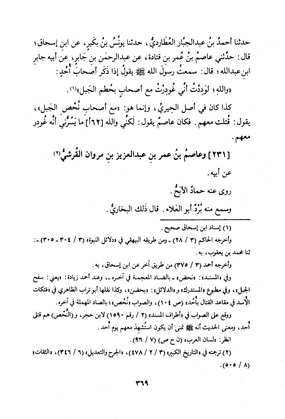 حَدثنَا أَحْمد بن عبد الْجَبَّار العطاردي حَدثنَا يُونُس بن بكير عَن ابْن اسحاق قَالَ حَدثنِي عَاصِم بن عمر بن قَتَادَة عَن عبد الرَّحْمَن بن جَابر عَن ابيه جَابر ابْن عبد الله قَالَ سَمِعت رَسُول الله صلى الله عَلَيْهِ وَسلم يَقُول إِذا ذكر أَصْحَاب أحد