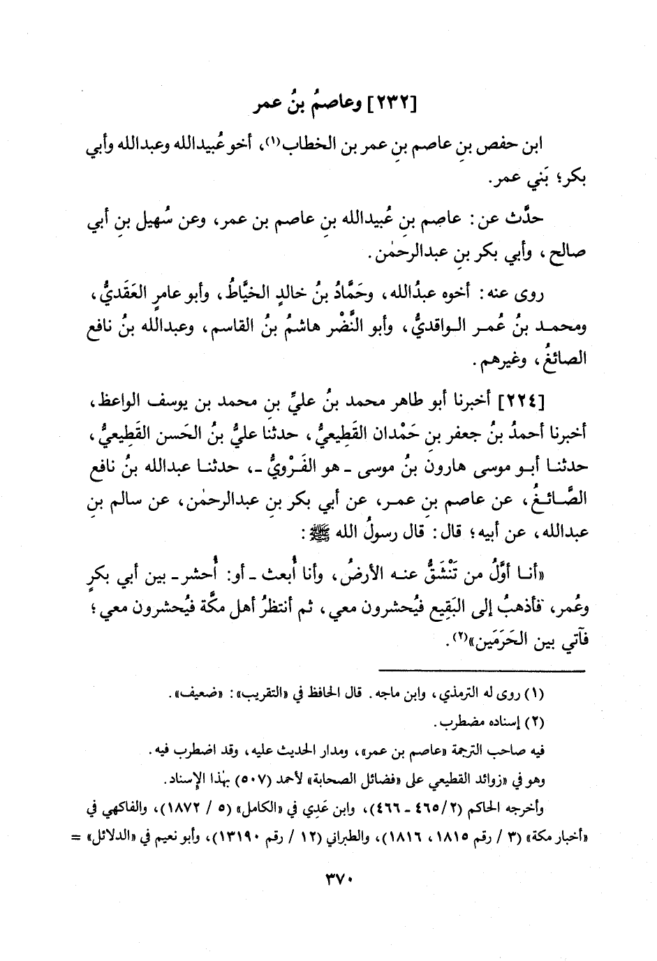 224 - أخبرنَا أَبُو طَاهِر مُحَمَّد بن عَليّ بن مُحَمَّد بن يُوسُف الْوَاعِظ أخبرنَا أَحْمد بن جَعْفَر بن حمدَان الْقطيعِي حَدثنَا عَليّ بن الْحسن الْقطيعِي حَدثنَا أَبُو مُوسَى هَارُون بن مُوسَى هُوَ الفروى حَدثنَا عبد الله بن نَافِع الصَّائِغ عَن عَاصِم بن عمر عَن أبي بكر بن عبد الرَّحْمَن عَن سَالم بن عبد الله عَن ابيه قَالَ قَالَ رَسُول الله صلى الله عَلَيْهِ وَسلم