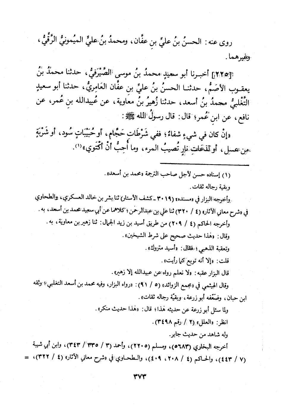 إِن كَانَ فِي شَيْء شِفَاء فَفِي شرطات حجام أَو حبيبات سود أَو شربة من عسل أَو لذعات نَار تصيب الْمَرْء وَمَا أحب أَن اكتوي