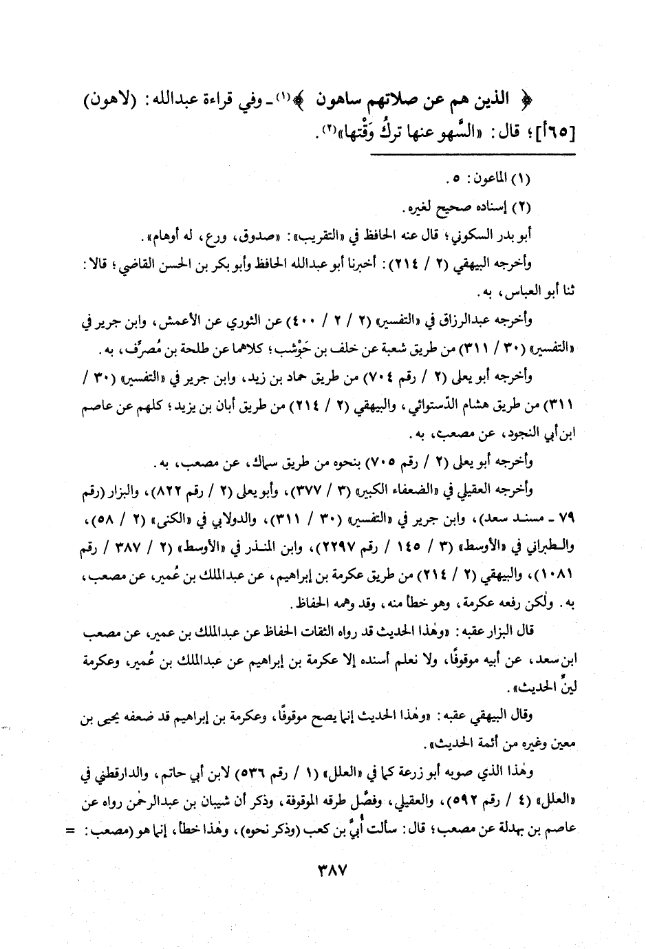 {الَّذين هم عَن صلَاتهم ساهون} وَفِي قِرَاءَة عبد الله (لاهون) 65 اقال السَّهْو عَنْهَا ترك وَقتهَا