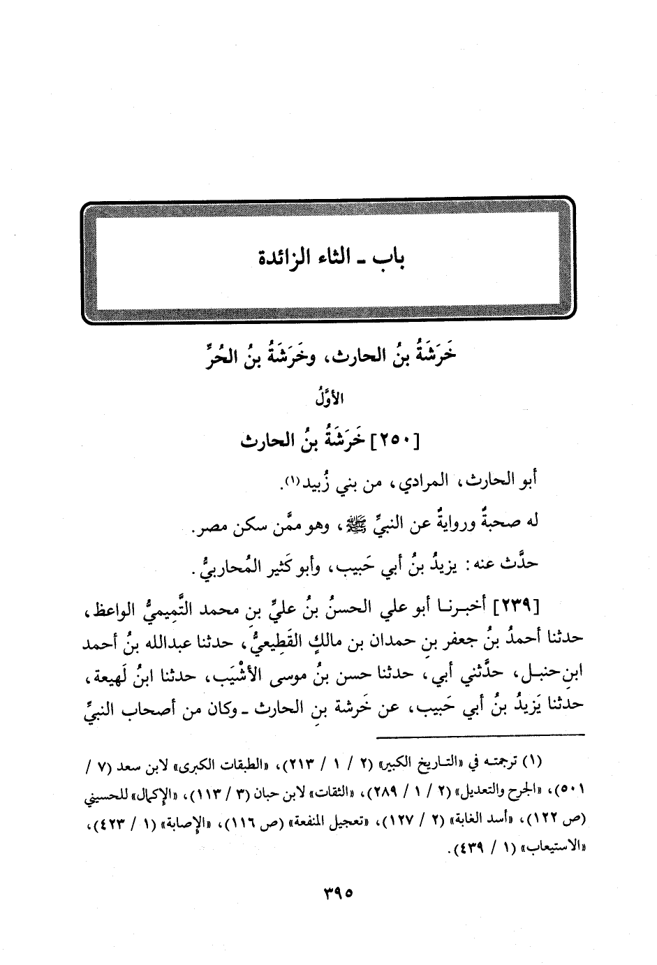 239 - أخبرنَا أَبُو عَليّ الْحسن بن عَليّ بن مُحَمَّد التَّمِيمِي الْوَاعِظ حَدثنَا أَحْمد بن جَعْفَر بن حمدَان بن مَالك الْقطيعِي حَدثنَا عبد الله بن أَحْمد ابْن حَنْبَل حَدثنِي ابي حَدثنَا حسن بن مُوسَى الأشيب حَدثنَا ابْن لَهِيعَة حَدثنَا يزِيد بن أبي حبيب عَن خَرشَة بن الْحَارِث وَكَانَ من أَصْحَاب النَّبِي