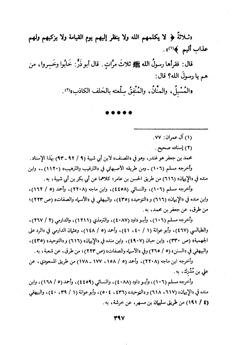 ثَلَاثَة لَا يكلمهم الله وَلَا ينظر إِلَيْهِم يَوْم الْقِيَامَة وَلَا يزكيهم وَلَهُم عَذَاب أَلِيم