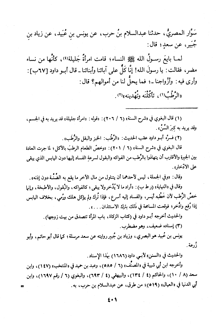 لما بَايع رَسُول الله صلى الله عَلَيْهِ وَسلم النِّسَاء قَامَت امْرَأَة جليلة كَأَنَّهَا من نسَاء مُضر فَقَالَت يَا رَسُول الله إِنَّا كل على آبَائِنَا وأبنائنا قَالَ أَبُو دَاوُد وَأرى فِيهِ وَأَزْوَاجنَا فَمَا يحل لنا من أَمْوَالنَا قَالَ الرطب تأكلنه وتهدينه