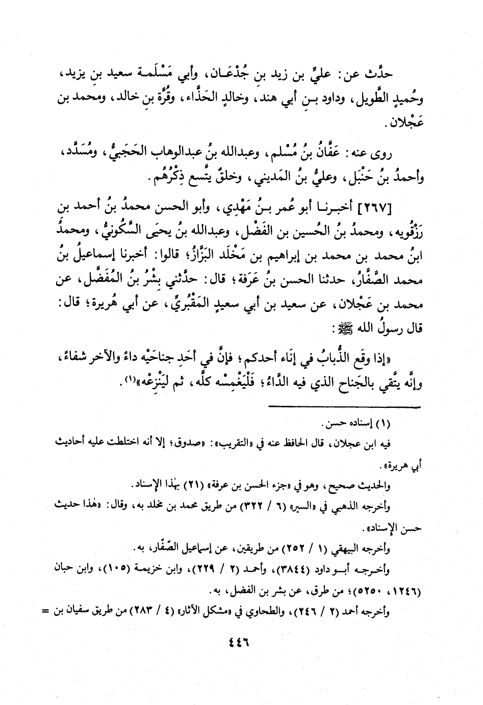 إِذا وَقع الذُّبَاب فِي إِنَاء أحدكُم فَإِن فِي أحد جناحيه دَاء وَالْآخر شِفَاء وَإنَّهُ يَتَّقِي بالجناح الَّذِي فِيهِ الدَّاء فليغمسه كُله ثمَّ لينزعه