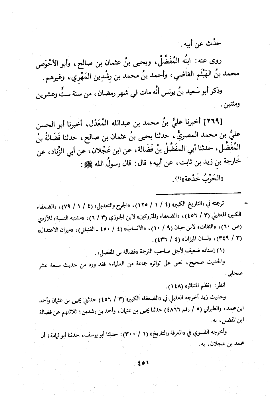 269 - أخبرنَا عَليّ بن مُحَمَّد بن عبد الله الْمعدل أخبرنَا أَبُو الْحسن عَليّ بن مُحَمَّد الْمصْرِيّ حَدثنَا يحيى بن عُثْمَان بن صَالح حَدثنَا فضَالة بن الْمفضل حَدثنَا أبي الْمفضل بن فضَالة عَن ابْن عجلَان عَن أبي الزِّنَاد عَن خَارِجَة بن زيد بن ثَابت عَن أَبِيه قَالَ قَالَ رَسُول الله صلى الله عَلَيْهِ وَسلم الْحَرْب خدعة