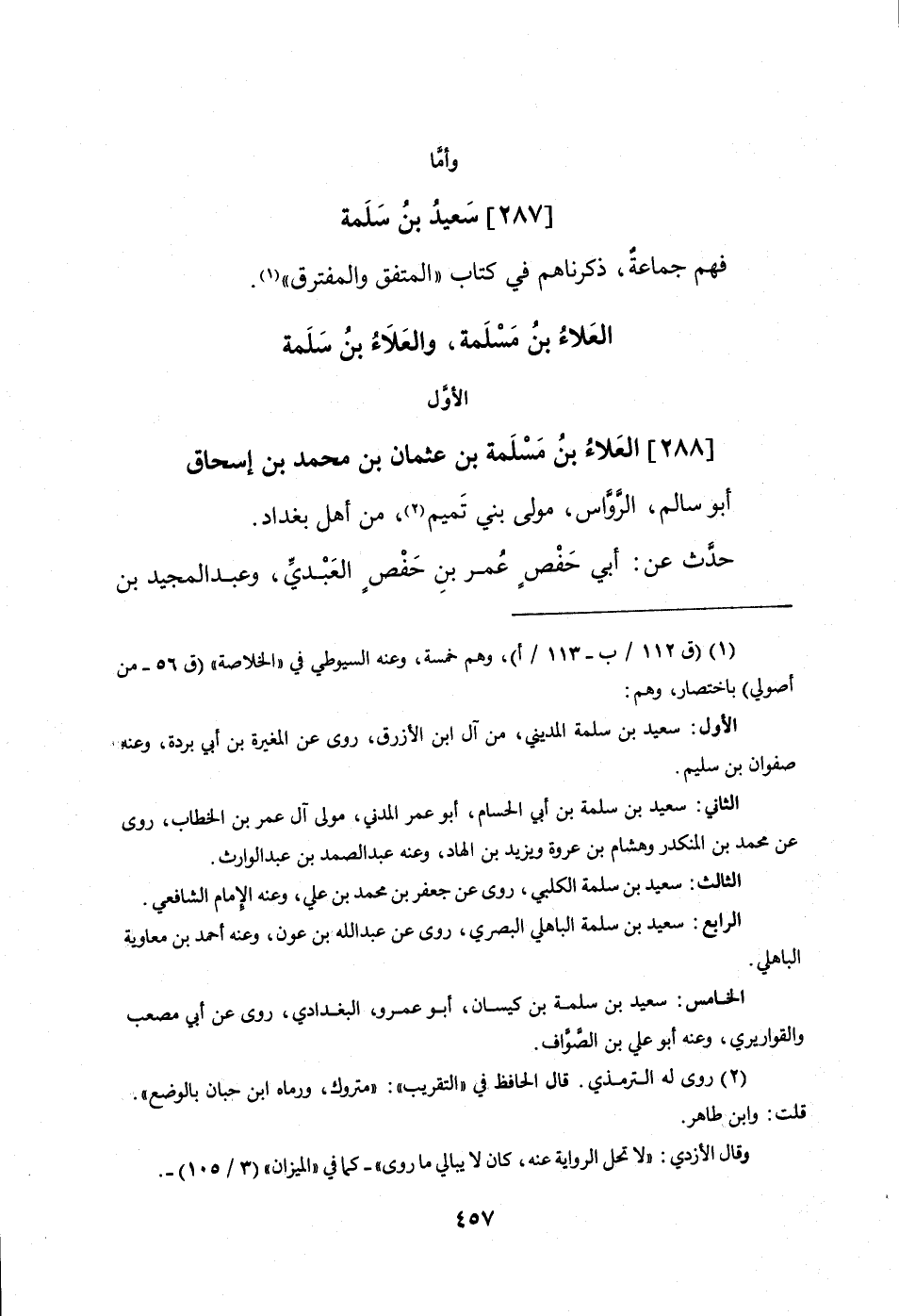 الأول [288] الْعَلَاء بن مسلمة بن عُثْمَان بن مُحَمَّد بن إِسْحَاق أَبُو سَالم الرواس مولى بني تَمِيم من أهل بَغْدَاد