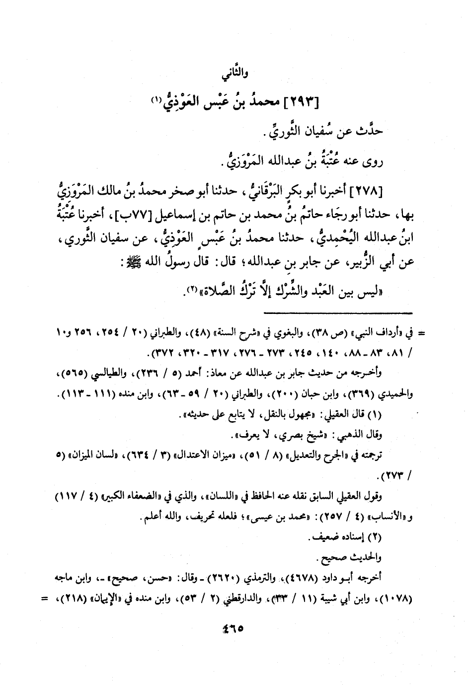 278 - أخبرنَا أَبُو بكر البرقاني حَدثنَا أَبُو صَخْر مُحَمَّد بن مَالك الْمروزِي بهَا حَدثنَا أَبُو رَجَاء حَاتِم بن مُحَمَّد بن حَاتِم بن إِسْمَاعِيل [77 ب] أخبرنَا عتبَة ابْن عبد الله اليحمدي حَدثنَا مُحَمَّد بن عبس العوذي عَن سُفْيَان الثَّوْريّ عَن أبي الزبير عَن جَابر بن عبد الله قَالَ قَالَ رَسُول الله صلى الله عَلَيْهِ وَسلم لَيْسَ بَين العَبْد والشرك إِلَّا ترك الصَّلَاة