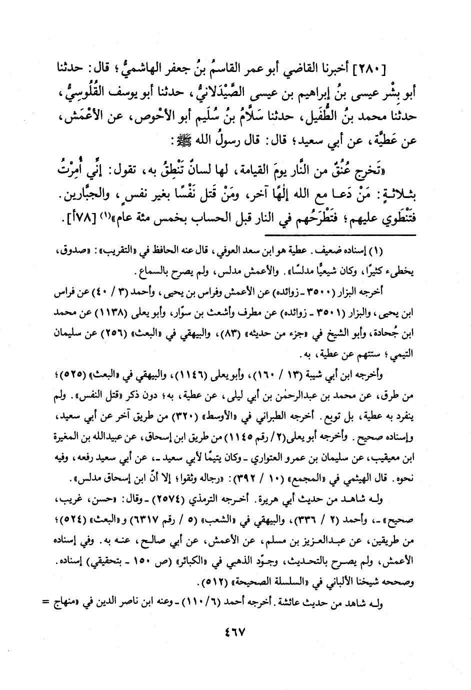 [280] أخبرنَا القَاضِي أَبُو عمر الْقَاسِم بن جَعْفَر الْهَاشِمِي قَالَ حَدثنَا أَبُو بشر عِيسَى بن إِبْرَاهِيم بن عِيسَى الصيدلاني حَدثنَا أَبُو يُوسُف القلوسي حَدثنَا مُحَمَّد بن الطُّفَيْل حَدثنَا سَلام بن سليم أَبُو الْأَحْوَص عَن الْأَعْمَش عَن عَطِيَّة عَن أبي سعيد قَالَ قَالَ رَسُول الله صلى الله عَلَيْهِ وَسلم تخرج عنق من النَّار يَوْم الْقِيَامَة لَهَا لِسَان تنطق بِهِ تَقول إِنِّي أمرت بِثَلَاثَة من دَعَا مَعَ الله إِلَهًا آخر وَمن قتل نفسا بِغَيْر نفس والجبارين فتنطوي عَلَيْهِم فتطرحهم فِي النَّار قبل الْحساب بِخمْس مئة عَام [78 أ]