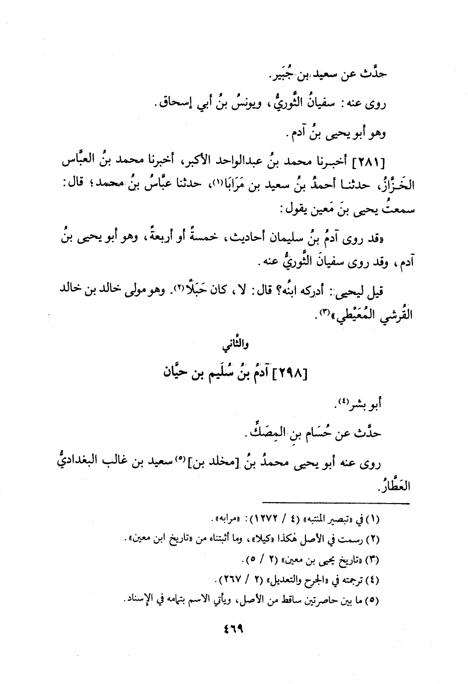 281 - أخبرنَا مُحَمَّد بن عبد الْوَاحِد الْأَكْبَر أخبرنَا مُحَمَّد بن الْعَبَّاس الخزاز حَدثنَا أَحْمد بن سعيد بن مرابا حَدثنَا عَبَّاس بن مُحَمَّد قَالَ سَمِعت يحيى بن معِين يَقُول قد روى آدم بن سُلَيْمَان أَحَادِيث خَمْسَة أَو أَرْبَعَة وَهُوَ أَبُو يحيى بن آدم وَقد روى سُفْيَان الثَّوْريّ عَنهُ
