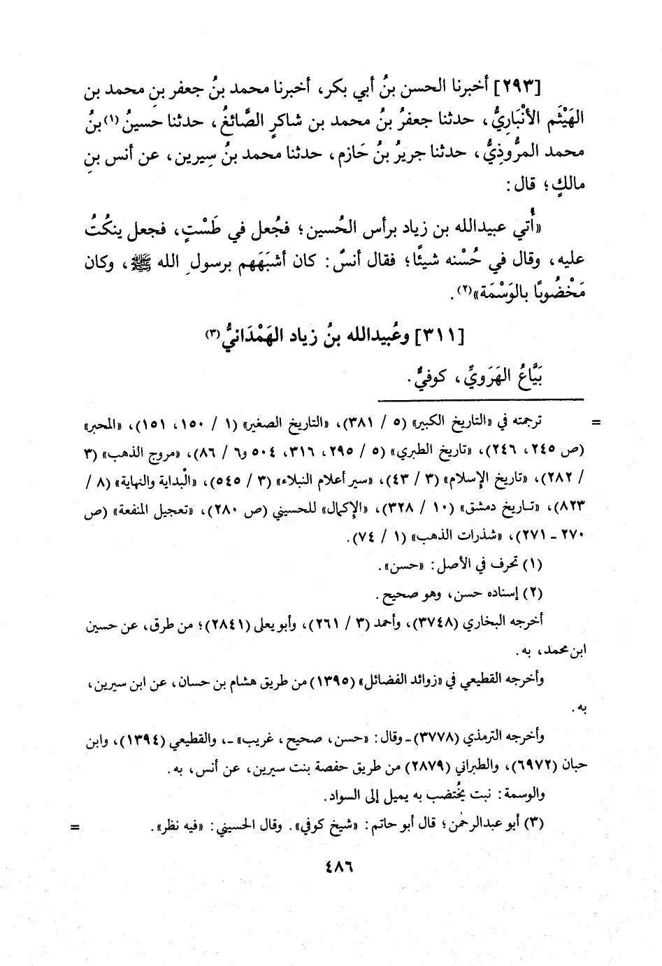 293 - أخبرنَا الْحسن بن أبي بكر أخبرنَا مُحَمَّد بن جَعْفَر بن مُحَمَّد بن الْهَيْثَم الْأَنْبَارِي حَدثنَا جَعْفَر بن مُحَمَّد بن شَاكر الصَّائِغ حَدثنَا حُسَيْن بن مُحَمَّد الْمَرْوذِيّ حَدثنَا جرير بن حَازِم حَدثنَا مُحَمَّد بن سِيرِين عَن أنس بن مَالك قَالَ أُتِي عبيد الله بن زِيَاد بِرَأْس الْحُسَيْن فَجعل فِي طست فَجعل ينكت عَلَيْهِ وَقَالَ فِي حسنه شَيْئا فَقَالَ أنس كَانَ أشبههم برَسُول الله صلى الله عَلَيْهِ وَسلم وَكَانَ مخضوبا بالوسمة