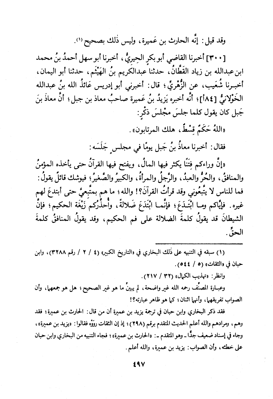 300 - اُخْبُرْنَا القَاضِي أَبُو بكر الْحِيرِي أخبرنَا أَبُو سهل أَحْمد بن مُحَمَّد ابْن عبد الله بن زِيَاد الْقطَّان حَدثنَا عبد الْكَرِيم بن الْهَيْثَم حَدثنَا أَبُو الْيَمَان أخبرنَا شُعَيْب عَن الزُّهْرِيّ قَالَ أَخْبرنِي أَبُو إِدْرِيس عَائِذ الله بن عبد الله الْخَولَانِيّ أَنه أخبرهُ يزِيد بن عميرَة صَاحب معَاذ بن جبل أَن معَاذ بن جبل كَانَ يَقُول كلما جلس مجْلِس ذكر الله حكم قسط هلك المرتابون فَقَالَ أخبرنَا معَاذ بن جبل يَوْمًا فِي مجْلِس جلسه