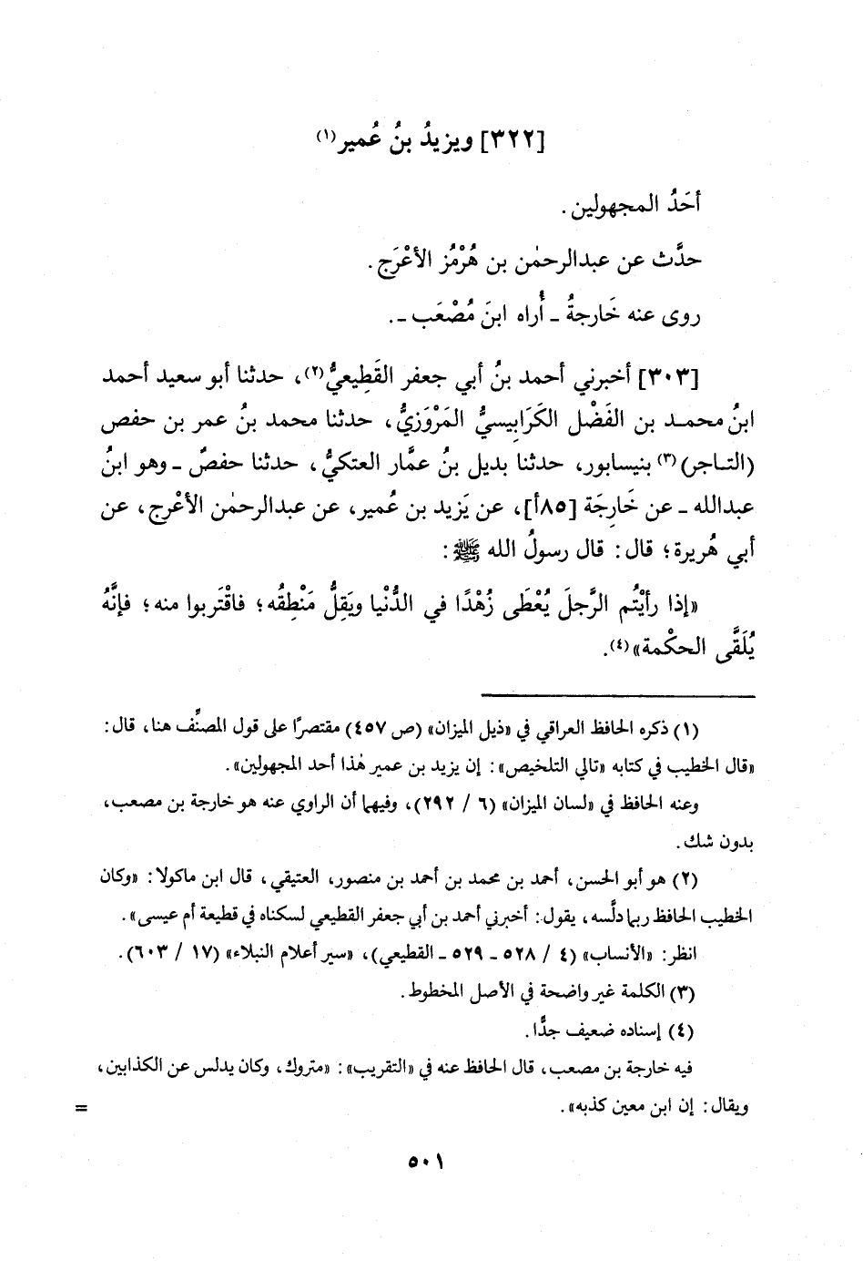 [322] وَيزِيد بن عُمَيْر أحد المجهولين حدث عَن عبد الرَّحْمَن بن هُرْمُز الْأَعْرَج روى عَنهُ خَارِجَة أرَاهُ ابْن