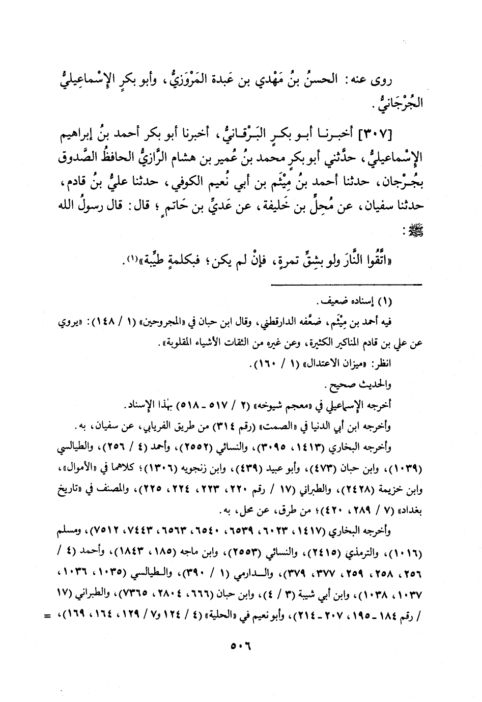 307 - أخبرنَا أَبُو بكر البرقاني أخبرنَا أَبُو بكر أَحْمد بن إِبْرَاهِيم الْإِسْمَاعِيلِيّ حَدثنِي أَبُو بكر مُحَمَّد بن عُمَيْر بن هِشَام الرَّازِيّ الْحَافِظ الصدوق بجرجان حَدثنَا أَحْمد بن ميثم بن أبي نعيم الْكُوفِي حَدثنَا عَليّ بن قادم حَدثنَا سُفْيَان عَن مَحل بن خَليفَة عَن عدي بن حَاتِم قَالَ قَالَ رَسُول الله صلى الله عَلَيْهِ وَسلم اتَّقوا النَّار وَلَو بشق تَمْرَة فَإِن لم يكن فبكلمة طيبَة