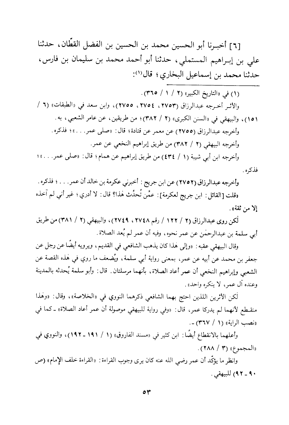 6 - أخبرنَا أَبُو الْحُسَيْن مُحَمَّد بن الْحُسَيْن بن الْفضل الْقطَّان حَدثنَا عَليّ بن إِبْرَاهِيم الْمُسْتَمْلِي حَدثنَا أَبُو أَحْمد مُحَمَّد بن سُلَيْمَان بن فَارس حَدثنَا مُحَمَّد بن إِسْمَاعِيل البُخَارِيّ قَالَ زِيَاد بن عِيَاض ختن أبي مُوسَى الْأَشْعَرِيّ حَدثنَا قبيصَة أخبرنَا يُونُس عَن عَامر عَن زِيَاد قَالَ صلى عمر فَلم يقْرَأ فَأَعَادَ وَالثَّانِي