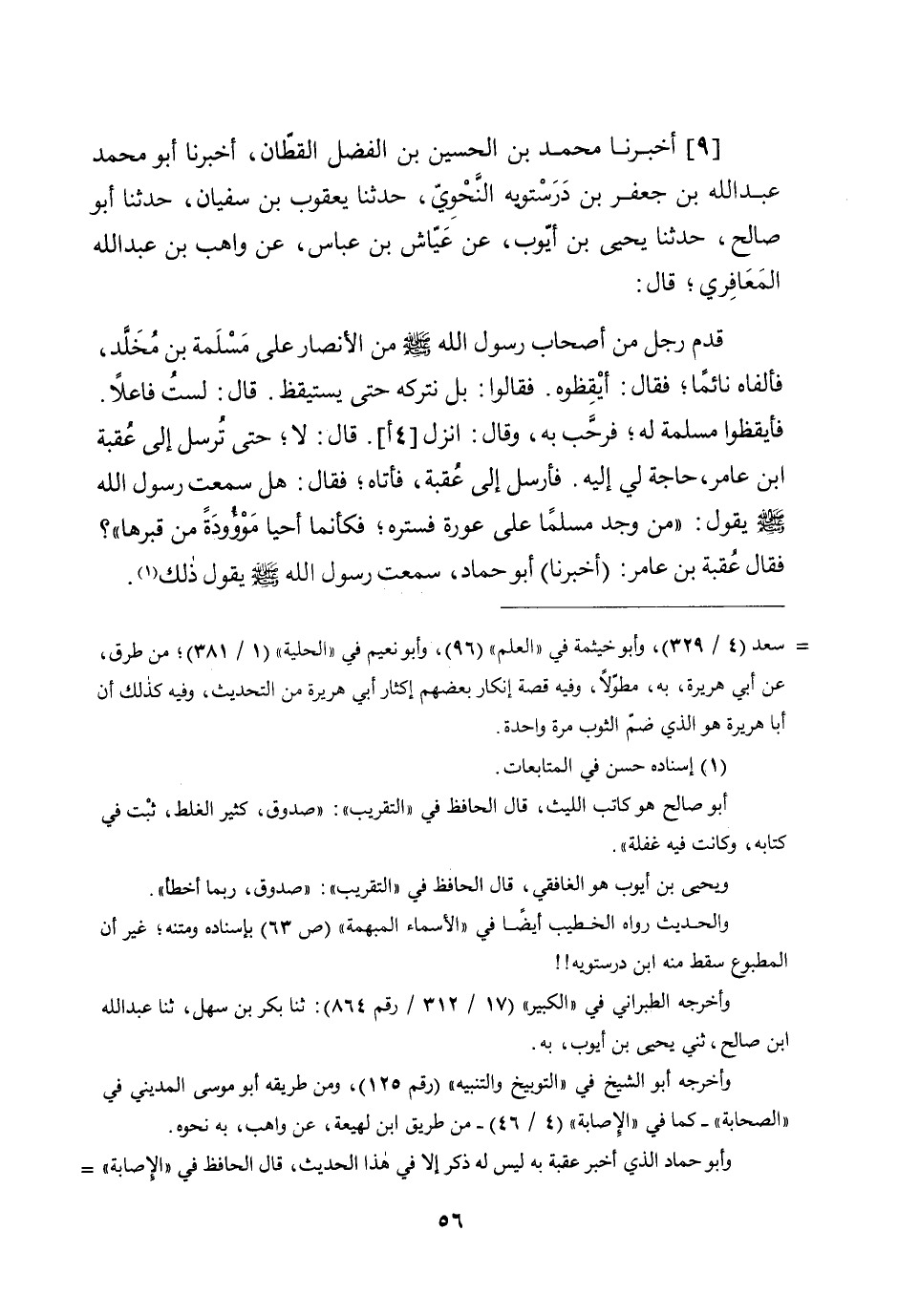 9 - أخبرنَا مُحَمَّد بن الْحُسَيْن بن الْفضل الْقطَّان أخبرنَا أَبُو مُحَمَّد عبد الله بن جَعْفَر بن درسْتوَيْه النَّحْوِيّ حَدثنَا يَعْقُوب بن سُفْيَان حَدثنَا أَبُو صَالح حَدثنَا يحيى بن أَيُّوب عَن عَيَّاش بن عَبَّاس عَن واهب بن عبد الله الْمعَافِرِي قَالَ قدم رجل من أَصْحَاب رَسُول الله صلى الله عَلَيْهِ وَسلم من الْأَنْصَار على مسلمة بن مخلد فألفاه نَائِما فَقَالَ أيقظوه فَقَالُوا بل نتركه حَتَّى يَسْتَيْقِظ قَالَ لست فَاعِلا فأيقظوا مسلمة لَهُ فَرَحَّبَ بِهِ وَقَالَ انْزِلْ (4 أ) قَالَ لَا حَتَّى ترسل إِلَى عقبَة ابْن عَامر حَاجَة لي إِلَيْهِ فَأرْسل إِلَى عقبَة فَأَتَاهُ فَقَالَ هَل سَمِعت رَسُول الله صلى الله عَلَيْهِ وَسلم يَقُول من وجد مُسلما على عَورَة فستره فَكَأَنَّمَا أَحْيَا موؤودة من قبرها فَقَالَ عقبَة بن عَامر (أخبرنَا) أَبُو حَمَّاد سَمِعت رَسُول الله صلى الله عَلَيْهِ وَسلم يَقُول ذَلِك